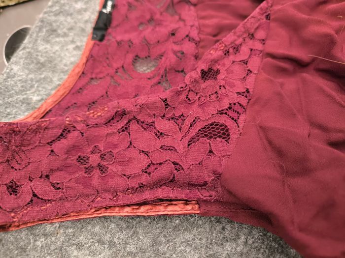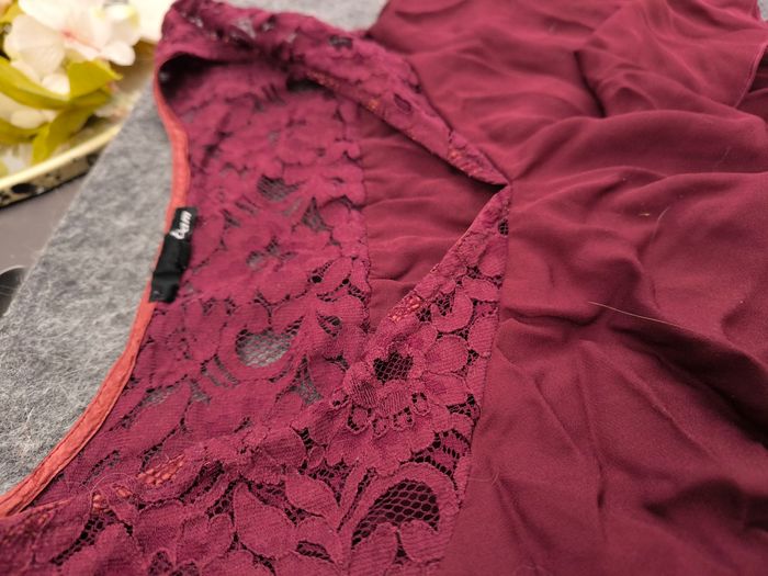Jolie robe bordeaux à volant avec un col en dentelle. Elle a été portée mais elle est en parfait état et ne s'abîme pas au lavage.