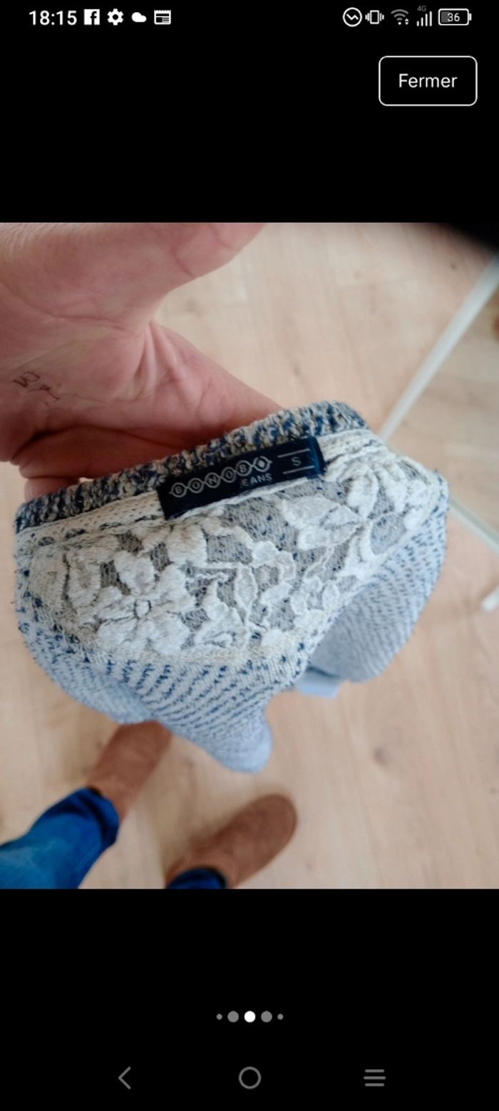 Joli pull de la marque Bonobo Jeans, modèle "BLISSAO". C’est une pièce confortable avec de jolis détails féminins. ​État : Très bon état. ​Taille : S (convient également à un XS pour un effet un peu plus fluide). ⚠️Les manches sont serrées ​Couleur : Bleu et blanc chiné avec de discrets fils métallisés dorés qui apportent de la luminosité (voir photo gros plan). ​Détail original : Empiècement en dentelle blanche fleurie à l'intérieur du col au dos. ​Matière : Mélange agréable (61% Coton, 17% Viscose, 17% Acrylique, 2% Fibre métallisée). ​Coupe : Col en V, manches longues. Idéal pour la mi-saison. Longueur 54 cm #calomomi_femme36 ​#bonobo #bonobojeans #pullbonobo #pullchine #pullfemme #tailleS #modedurable #dentelle #lookprintemps #pullleger #blissao
