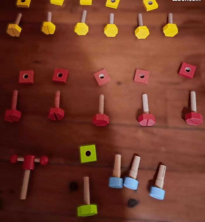 Etabli en bois enfant, traces de stylo, feutre sur l'établi ou les pièces en bois. Manque 1 écrou jaune.