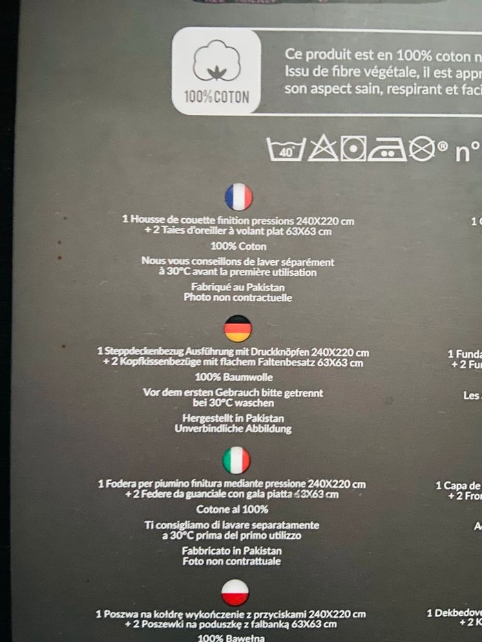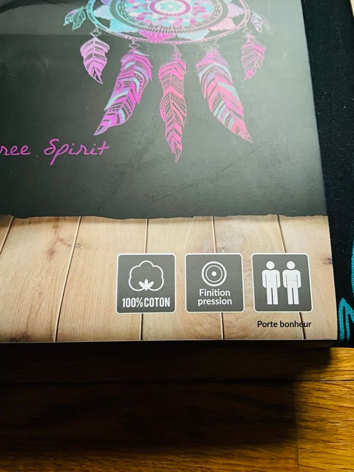 Parure de couette Free Spirit Porte-bonheur. Dimensions : 240x220 Housse de couette + 2 taies d’oreiller 63x63 100% coton naturel Finition pressions Certifié Oeko-Tex Neuve, jamais déballée.
