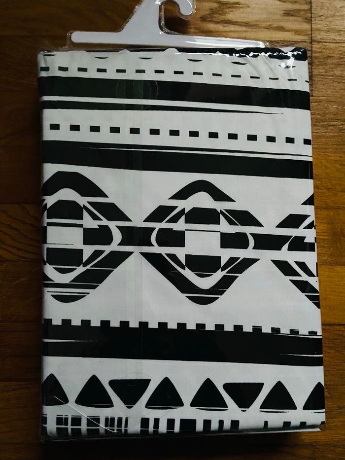 Parure de lit "Etnik" imprimée de motifs graphiques qui invitent au voyage. En coton, elle comprend une housse de couette deux personnes fermée par des boutons invisibles et 2 taies d'oreiller carrées. 100% coton - 57 fils Dimensions : 220x240 Réversible. Certifié Oeko-Tex. Neuve, jamais déballée.