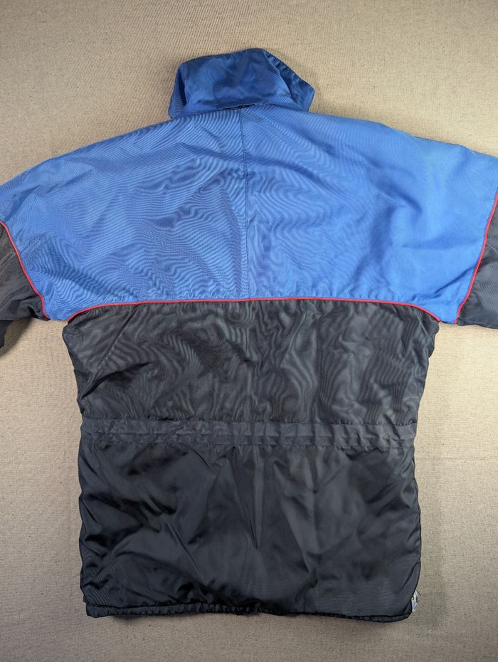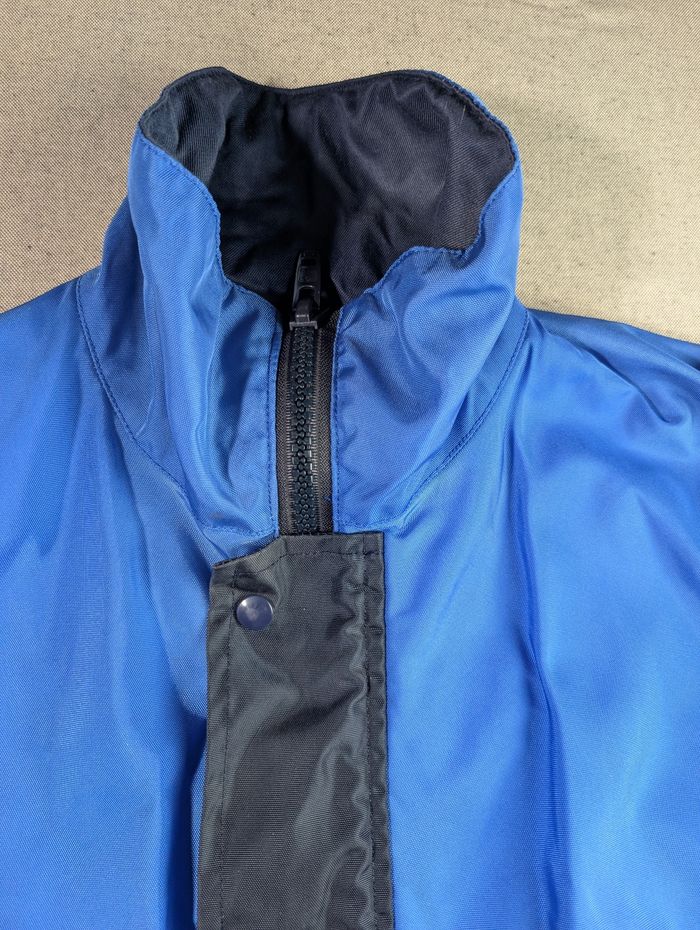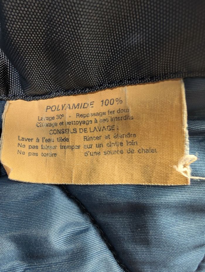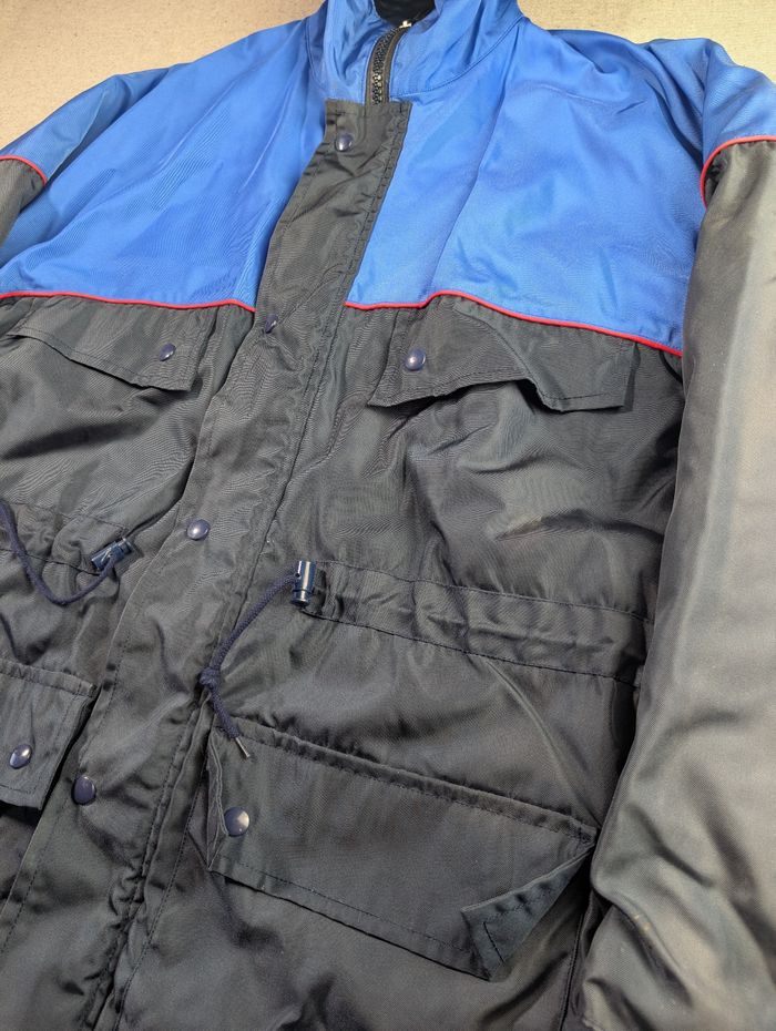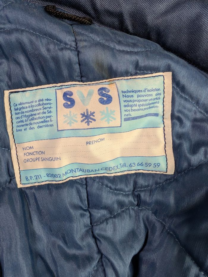 Véritable veste technique de travail vintage de la marque française SVS Montauban. C'est une pièce de style "workwear" authentique, extrêmement robuste et parfaite pour affronter le froid. Les points forts : Haute Isolation : Intérieur matelassé pour une protection thermique optimale. Matériaux Robustes : Tissu 100% Polyamide résistant à l'abrasion et aux intempéries. Pratique : Nombreuses poches fonctionnelles avec rabats de protection. Look : Style bicolore bleu et gris avec liseré rouge vintage. 📏 Mesures (prises à plat) : Aisselle à aisselle : 60 cm Longueur totale : 86 cm Longueur des manches : 49 cm (emmanchures basses) ✨ État : * Bon état vintage général, vêtement propre. À noter : Présence d'un petit accroc au dos (voir photos de détail), ce qui explique le prix réduit. Cela n'enlève rien à la solidité de cette pièce technique. Taille : Indiquée T5 / 54 (correspond à un XL confortable).
