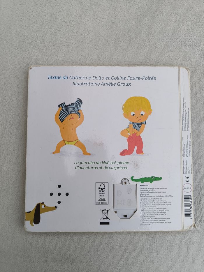 Livre sonore La journée de Noé Éditions Gallimard Jeunesse Giboulées • Pages cartonnées • Histoire sonore • Pastille couverture, 3eme et 5eme pastille qui ne fonctionnent plus • Tranches intérieures abîmées • Coins et arêtes abîmés/déchirés Seules 5 pastilles sur les 8 fonctionnent Piles non incluses En état satisfaisant #evelyne_livres