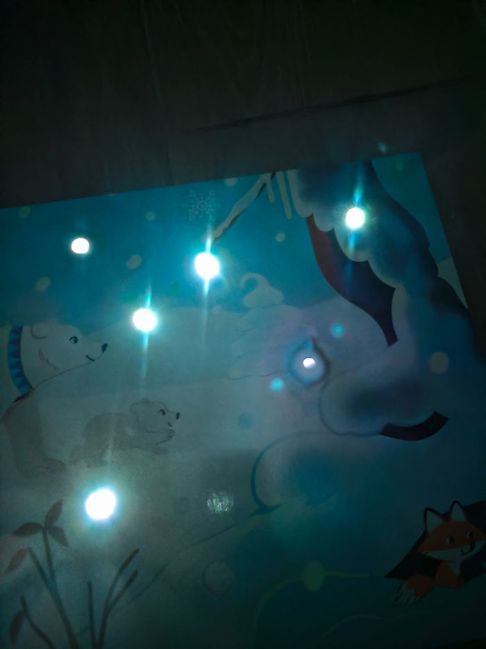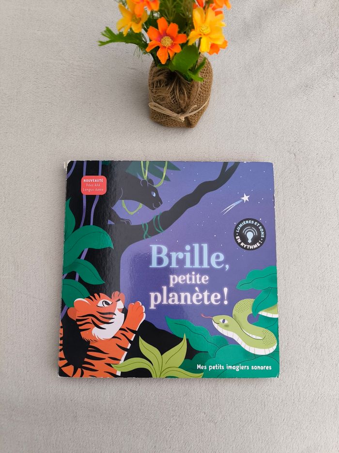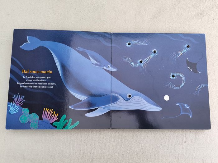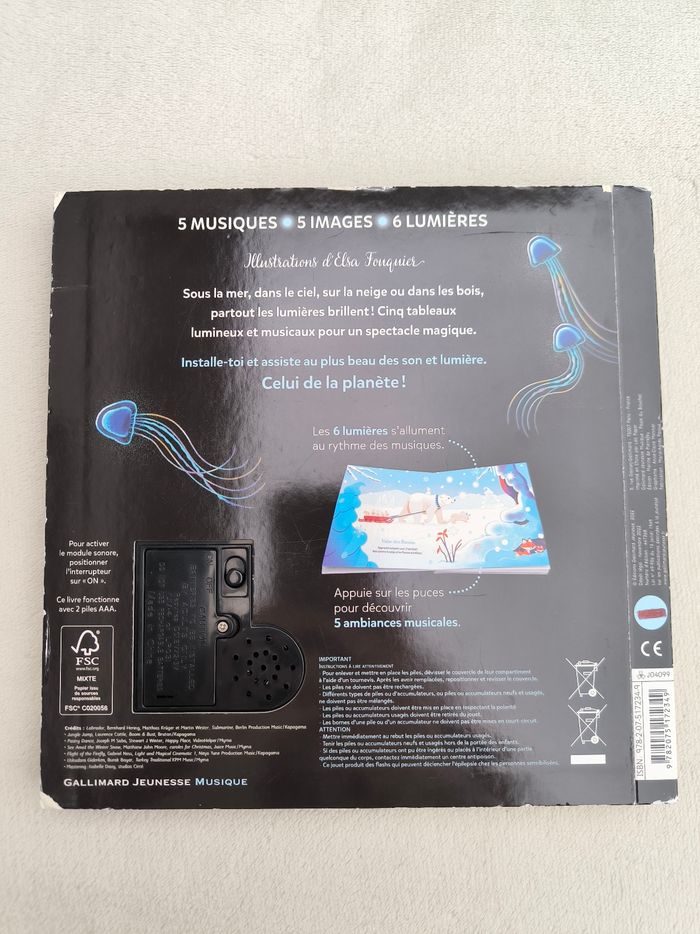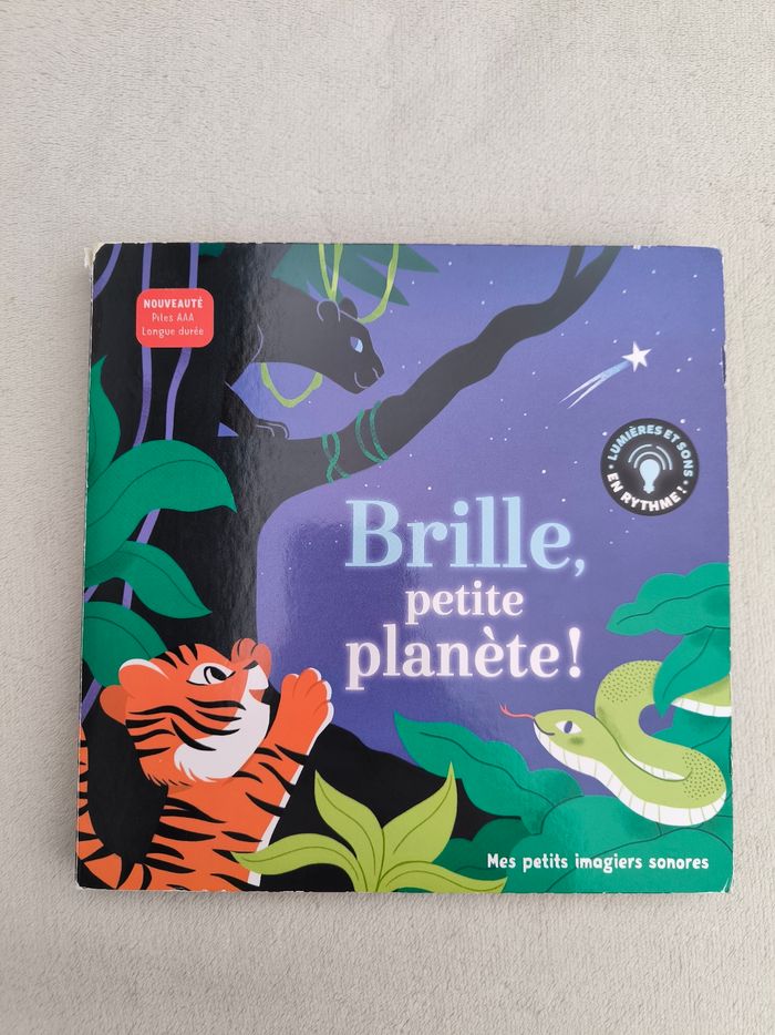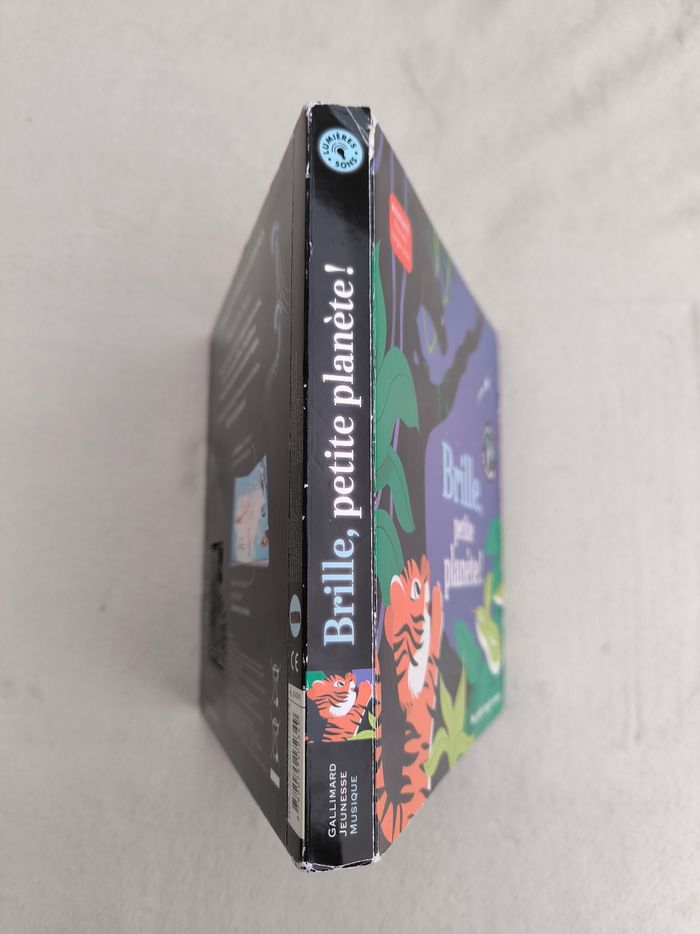 Livre musical et lumineux grand format Mes petits imagiers sonores : Brille, petite planète ! Éditions Gallimard Jeunesse Musique • Pages cartonnées • 5 musiques, 5 images, 6 lumières -> Bal sous-marin : méduse, baleines -> Mambo jungle : tigre, singe... -> Valse des flocons : ours polaires, lapins... -> Ballet de lucioles : chouette... -> Étoiles du désert : dromadaire... • Sons et lumières au rythme de la musique • Intérieur du livre en très bon état • Coins et arêtes abîmés Fonctionne Piles incluses En très bon état #evelyne_livres