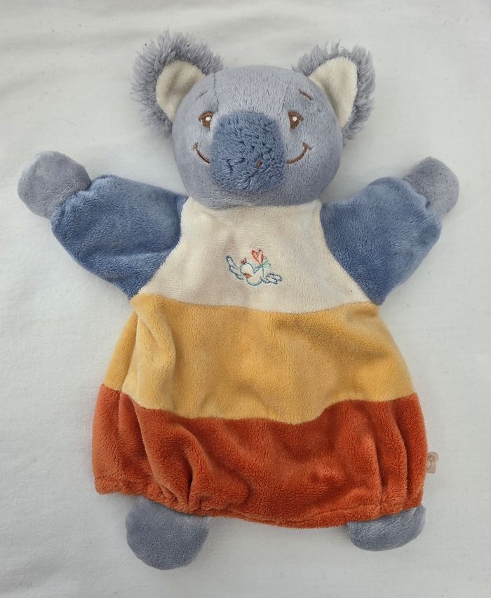 Doudou marionnette koala bleu ,orange,jaune - Oiseau - Noukies