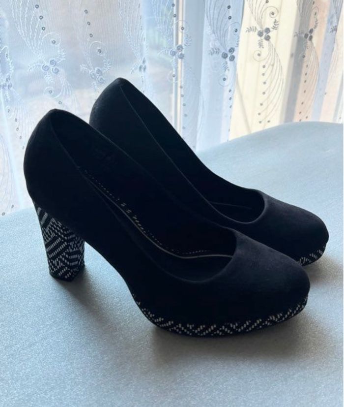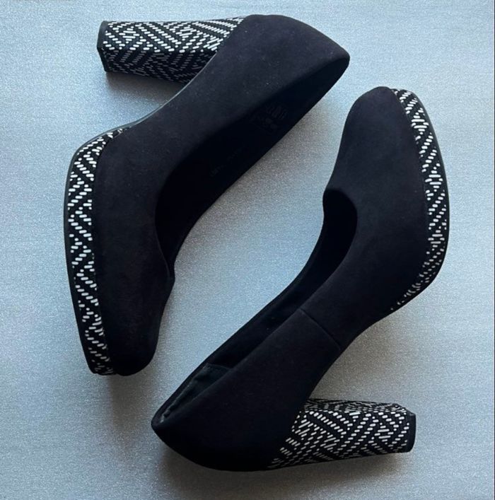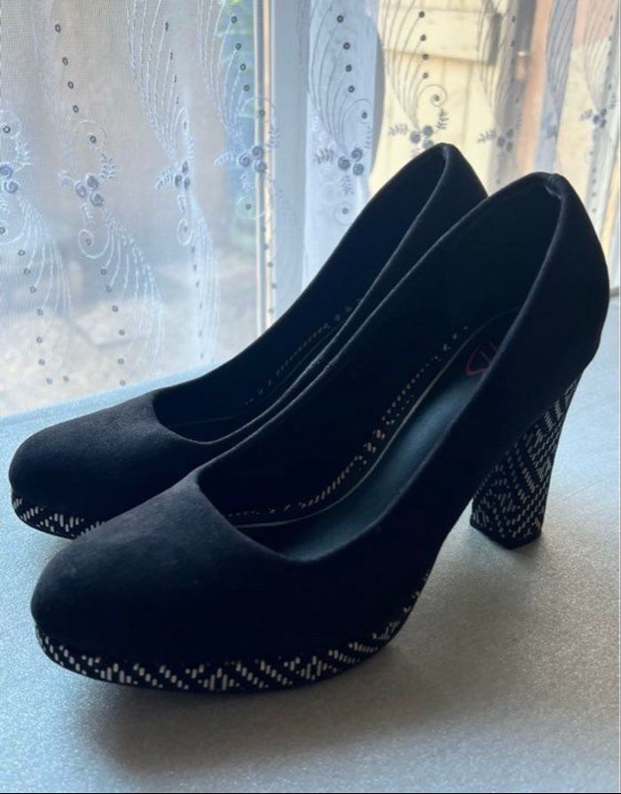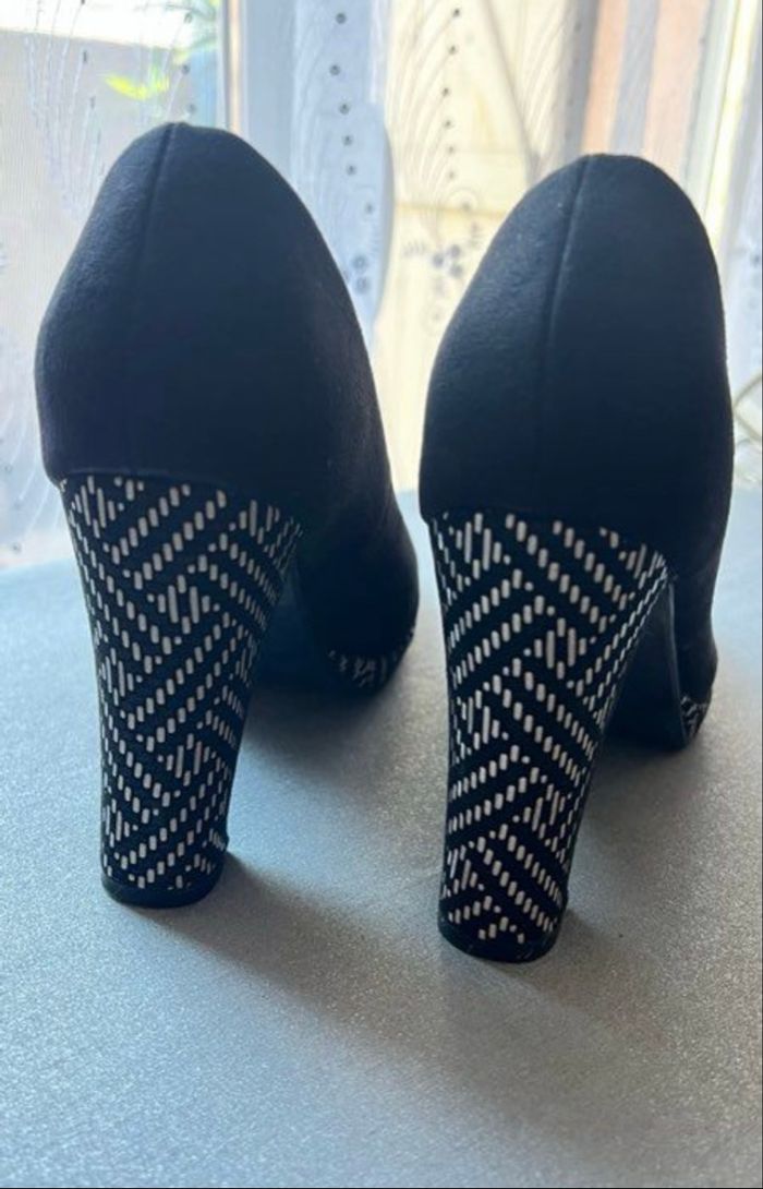Très belle paire de chaussures à talons épais Coloris noir et talons coloris noir et blanc Pointure 40 (trop grandes pour moi) Elles chaussent bien du 40 My B Talons 10 cm Style nubuck daim Quelques traces discrètes Je réponds rapidement aux messages Envoi rapide et soigné