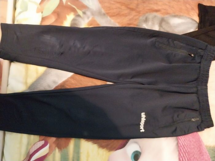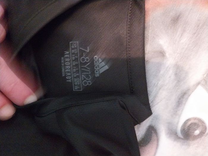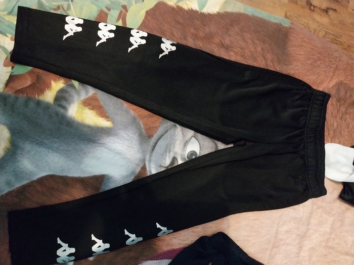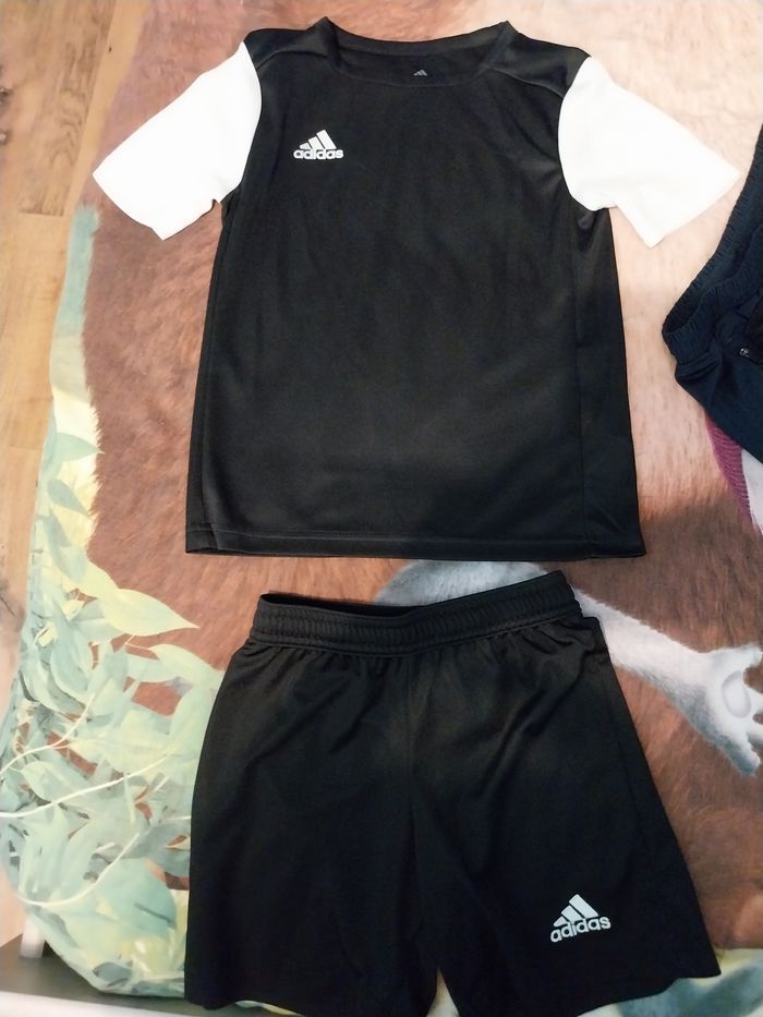 1 tee shirt bleu Adidas 7-8 ans 1 tee shirt noir Adidas 7-8 ans 1 short noir Adidas 5-6 ans 1 pantalon kappa taille 6 ans 1 pantalon marine taille 6 ans, abîmé au genou Hormis le pantalon abîmé, tout est en très bon état.
