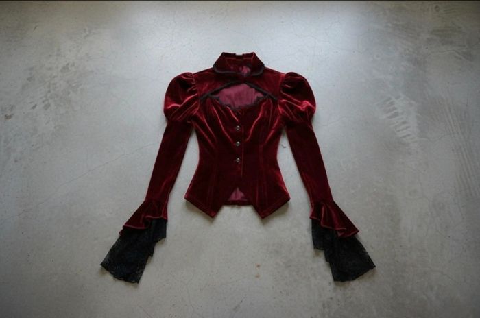 Blouse manches longues élégante en velours bordeaux avec dentelle noire décolletée sexie taille M/38 style Vicorian Y2K  - photo numéro 1