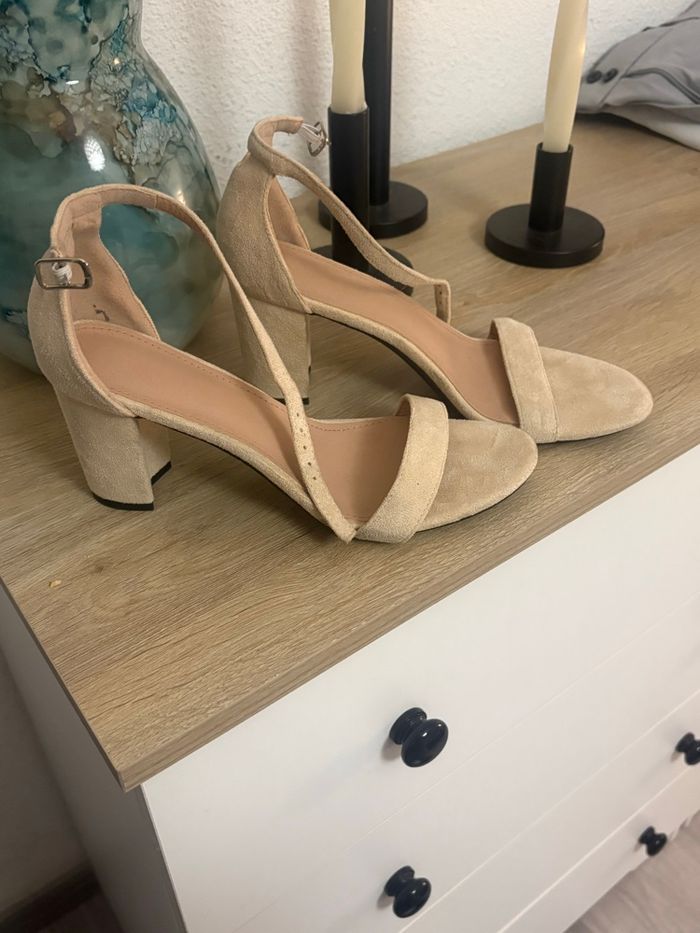 Une paire de chaussures à talons carrés pour femme, couleur beige en très bon état utilisé qu’une seule fois avec fermeture sur la cheville