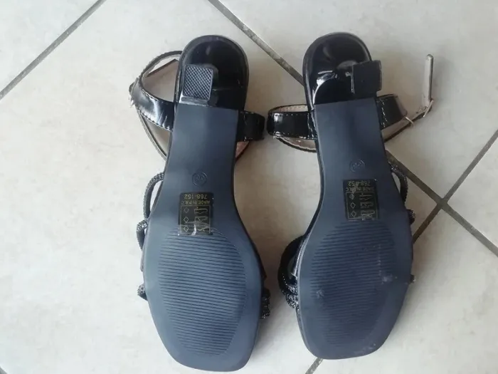 DE COULEUR NOIR AVEC DU BRILLANT, DONC IDEALES FETES OU SOIREE. TALON DE env cm. NEUVES JAMAIS PORTEES!! TAILLE NOTEE 38 (longueur semelle COMPLETE : env cm).