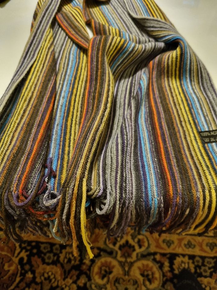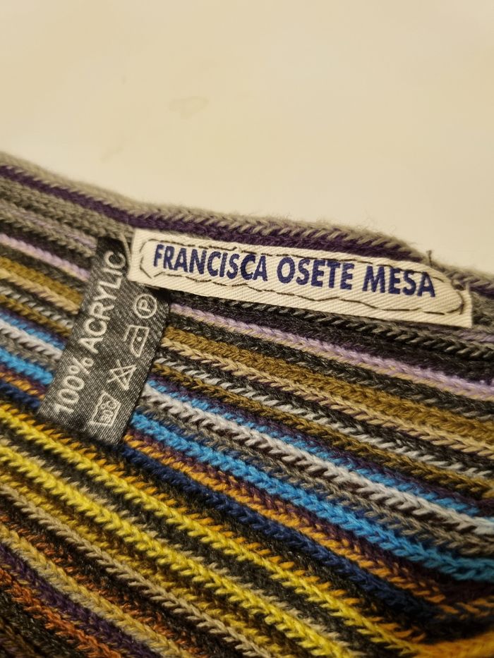 Écharpe élégante et originale, multicolore. Signature Francisca Osete Mesa. Tissu de belle qualité, style artisanal. Très bon état, propre et prête à porter. Convient aux adultes (femme / homme).190cm/30cm