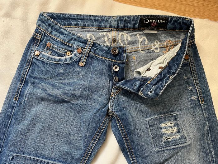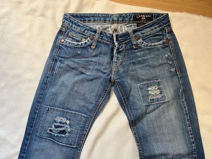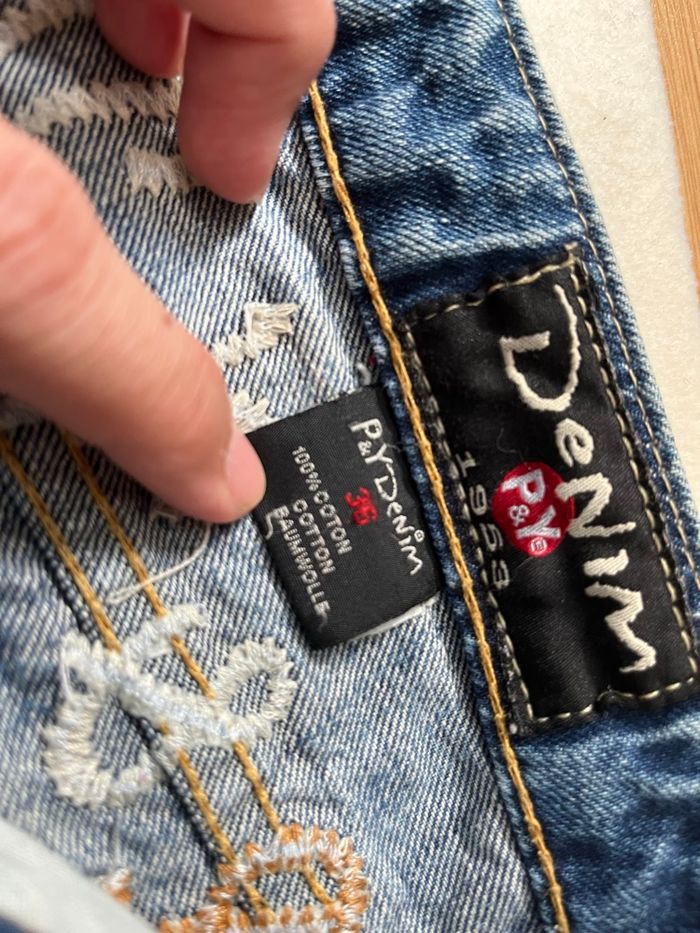 vends ce jean de couleur bleue marque P et Y denim taille 36 ou S avec des effets troués sur l'avant et sur l'arrière longueur 100 cm profondeur de fesses 25 cm longueur entre jambes bas 76 cm largeur de la taille 81 cm 25 euros Mes autres annonces de vêtement pour femme de XS à S #Ima42femmeS #Ima42femmeXS