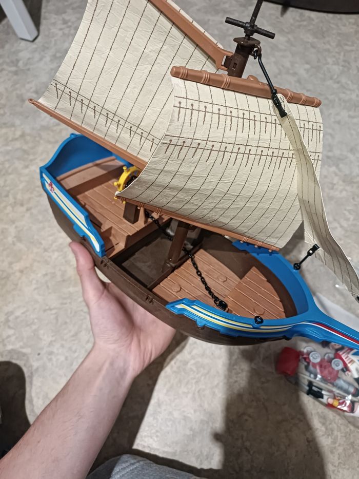 ⛵ Playmobil Bateau pirate / Voilier militaire britannique 🏴‍☠️ Playmobil bateau à voiles de style pirate ou militaire britannique, avec mâts, voiles textiles et détails décoratifs. Parfait pour les aventures en mer ! ✨ Détails : Bateau avec voiles et mât complets Design soigné et robuste Figurines et accessoires inclus (voir photo) Compatible univers pirate / soldats Playmobil 🌊 Idéal pour enfants ou collectionneurs. 📦 Vendu tel que présenté sur la photo.