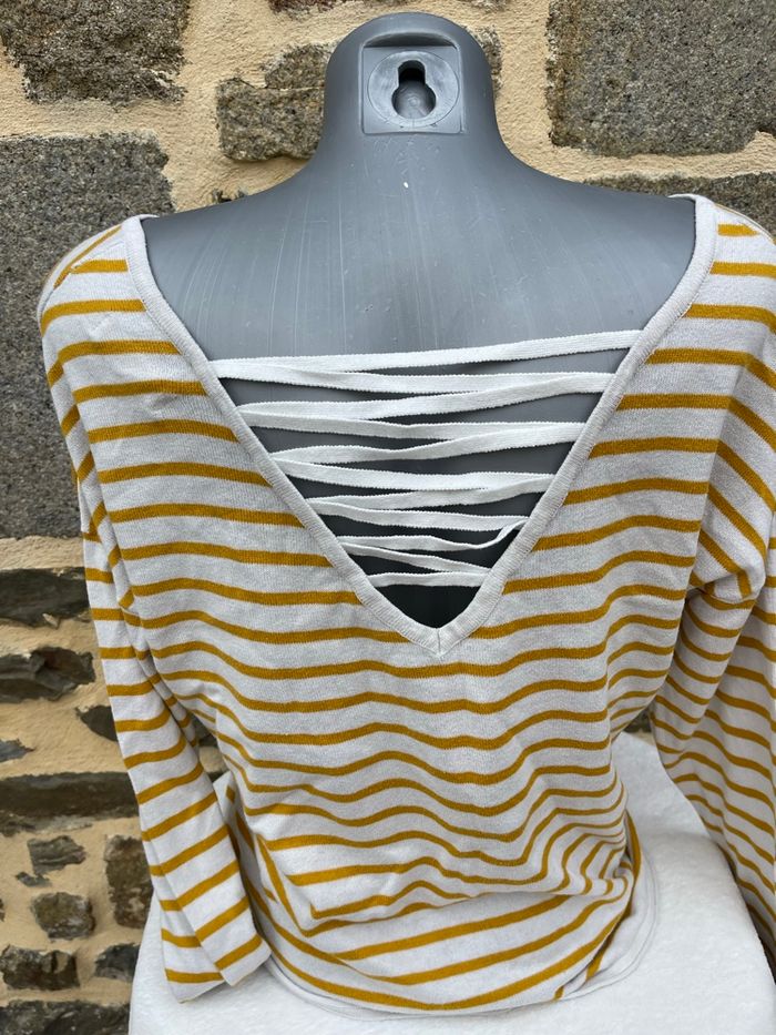 Pull crème en maille fine à rayure moutarde Laçage dans le dos Taille L Très bonne état Cache Cache