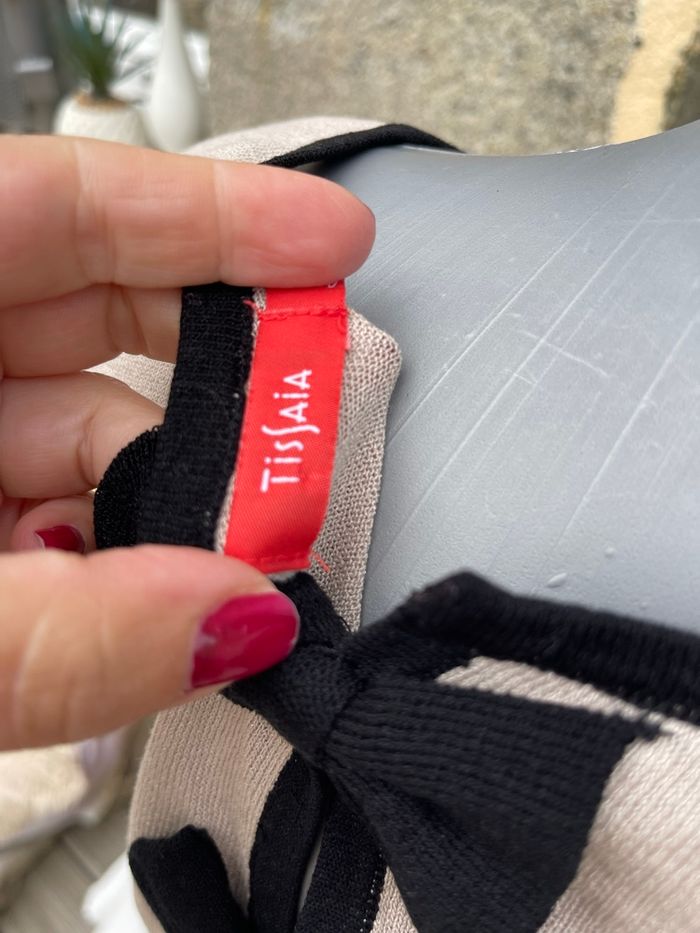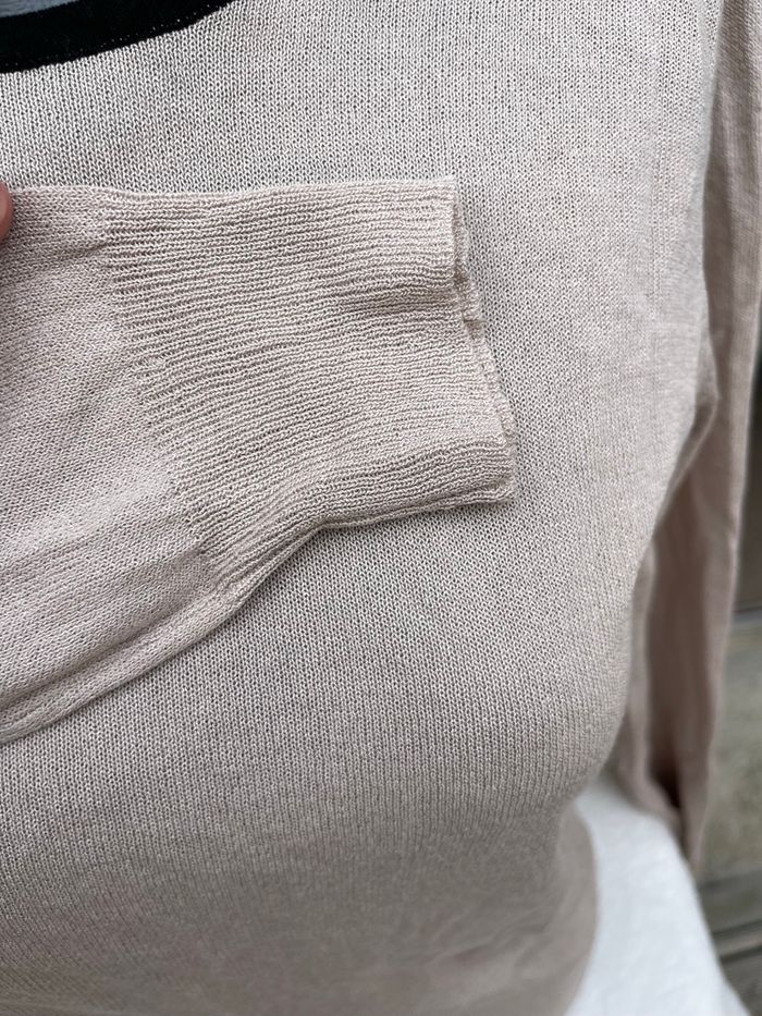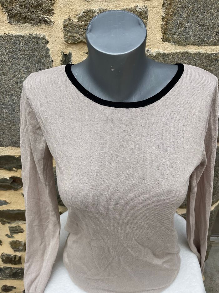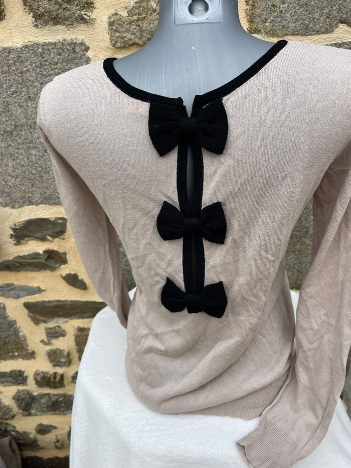 Pull en maille fine beige avec liserée noir et noeud dans le dos légèrement ajourée Taille L Très bonne état Tissaia