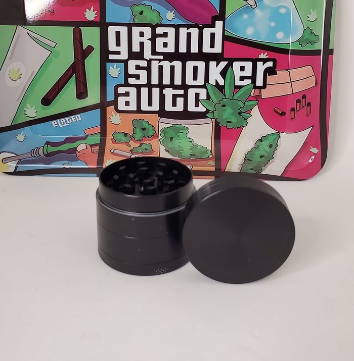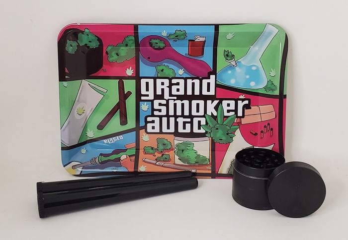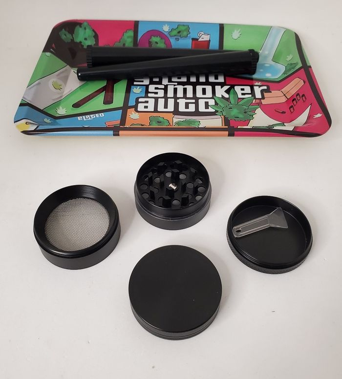 Kit plateau de roulage en métal 4 pièces neuf. Modèle GTA. Contient un plateau, 2 tube de rangement et un grinder.