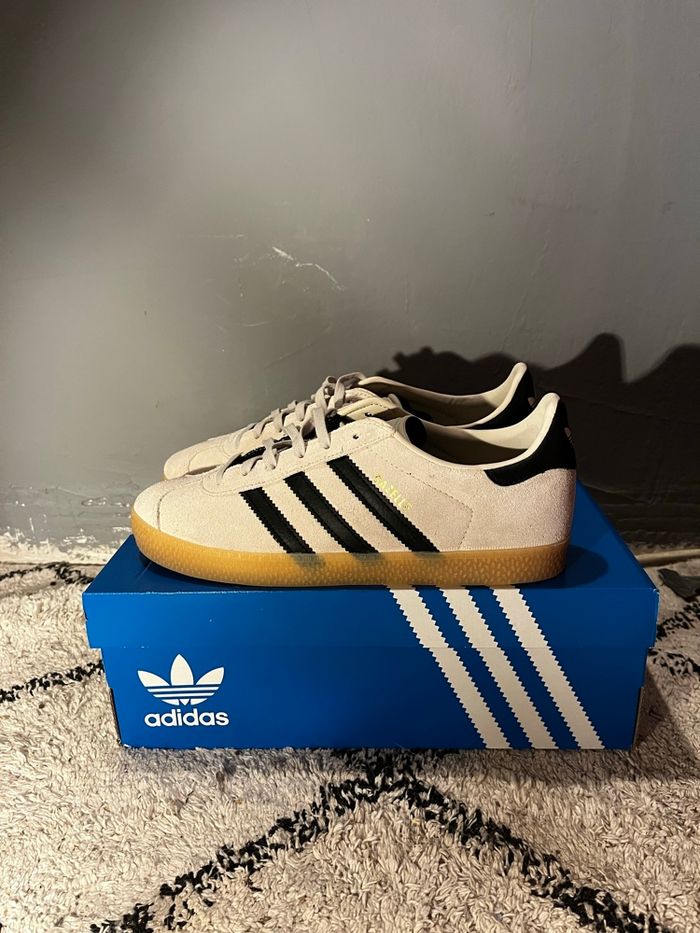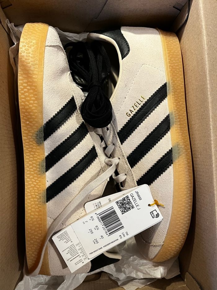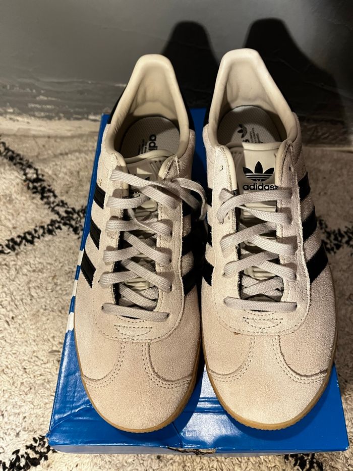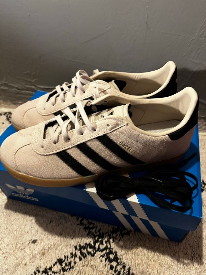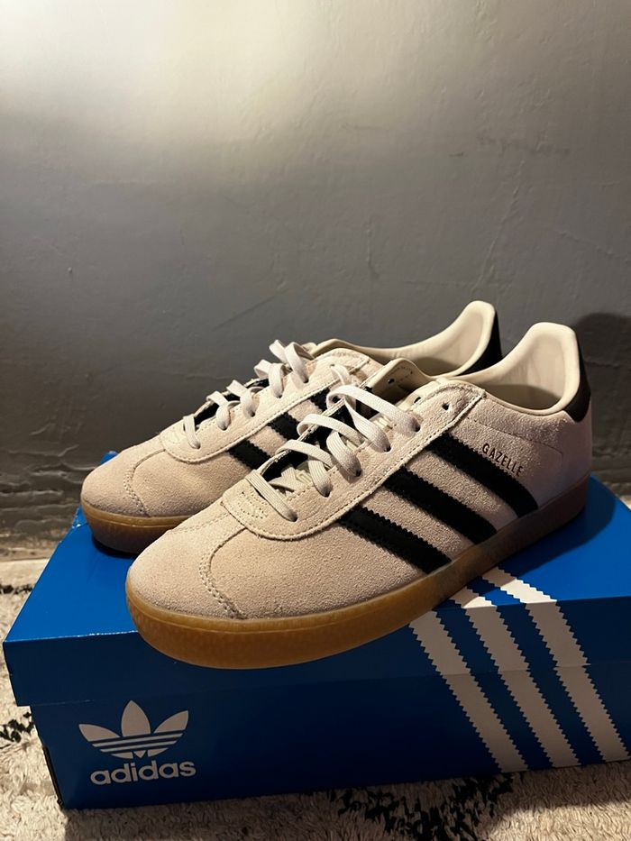 Salut je vend cette paire de Adidas Gazelle neuve ! 👟Chaussure : Adidas Gazelle 🎨Couleurs : beige/noir ✨États : neuf / jamais porté 💶Prix de base : 110 euros 📦Vendu avec sa boîte adidas Envoie rapide et protégée ! 💌📨