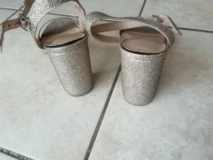 DE COULEUR DORÉ A LEGERES NUANCES ARGENTEES. MARQUE NEW LOOK. TALONS DE env 9,5cm. PORTEES, DONC PAS NEUVES MAIS RESTEES VRAIMENT BIEN. TAILLE NOTEE 38 MAIS VONT PLUTÔT POUR UN 37.5 (longueur semelle totale : env 24cm) .