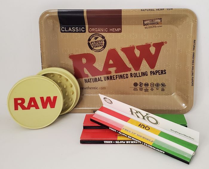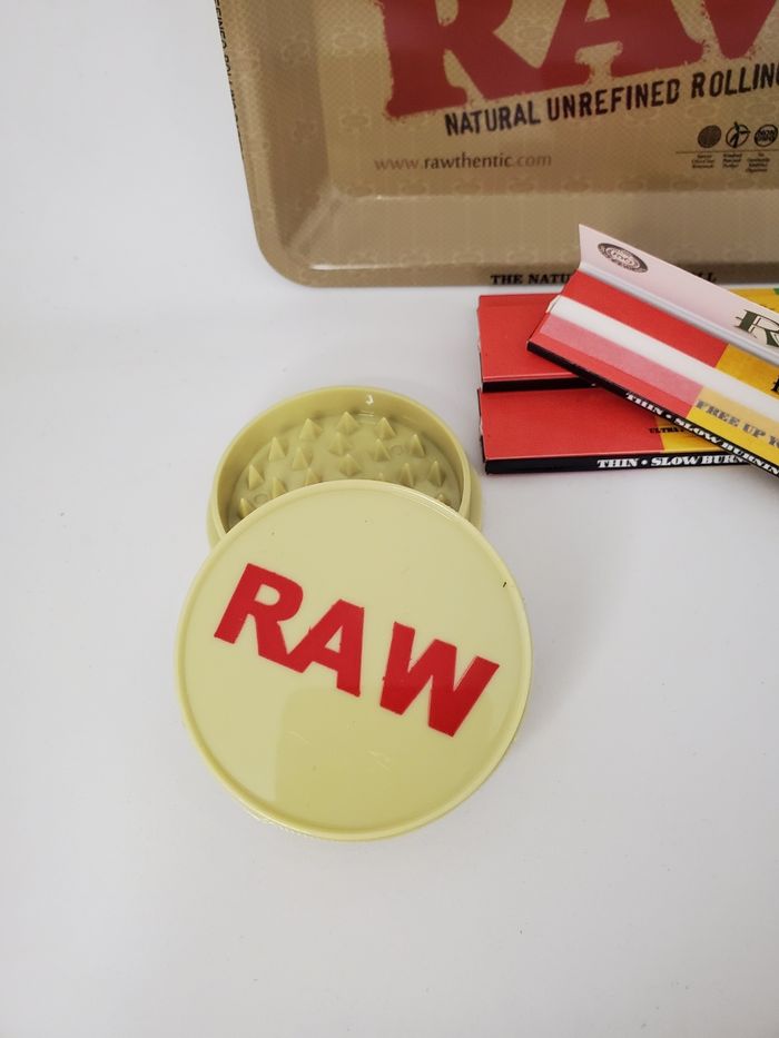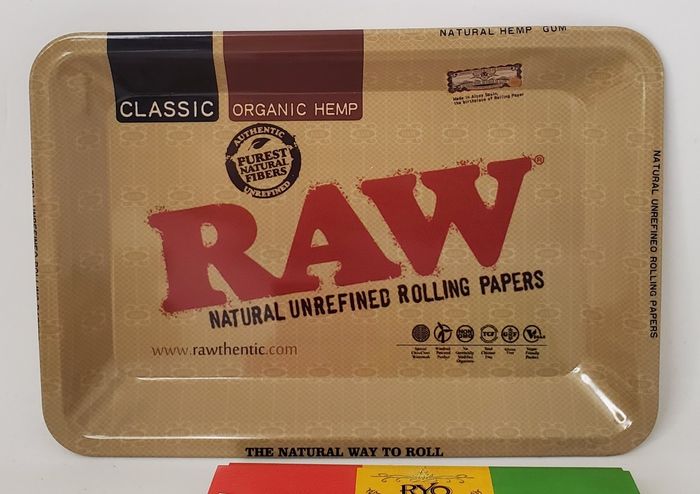 Kit plateau de roulage en métal 6 pièces neuf. Modèle Raw. Contient un plateau de roulage, un grinder et 4 carnets de feuilles taille king size.