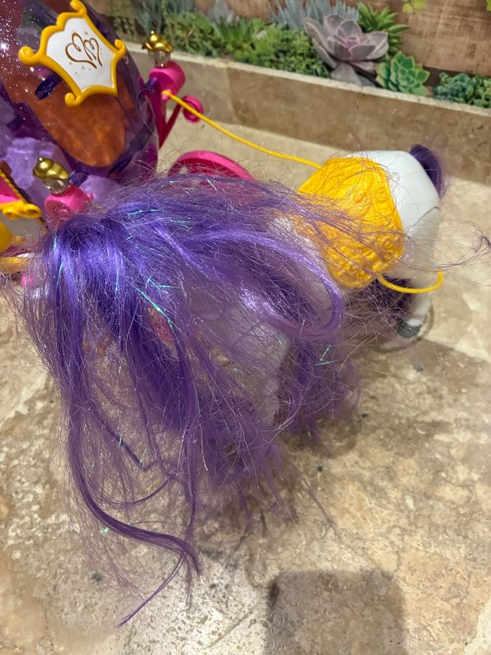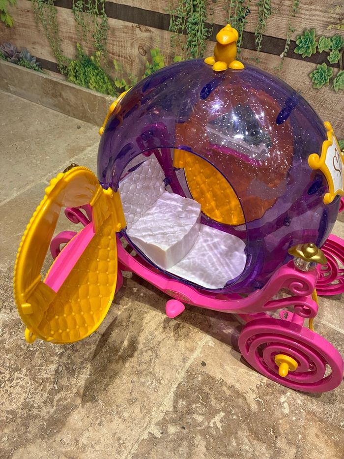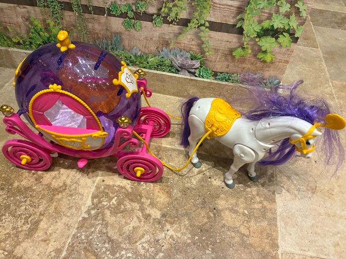 Carrosse de princesse pour poupée Barbie. Les portes du carrosse s’ouvrent. La crinière de cheval est emmêlé. Vendu sans barbie.