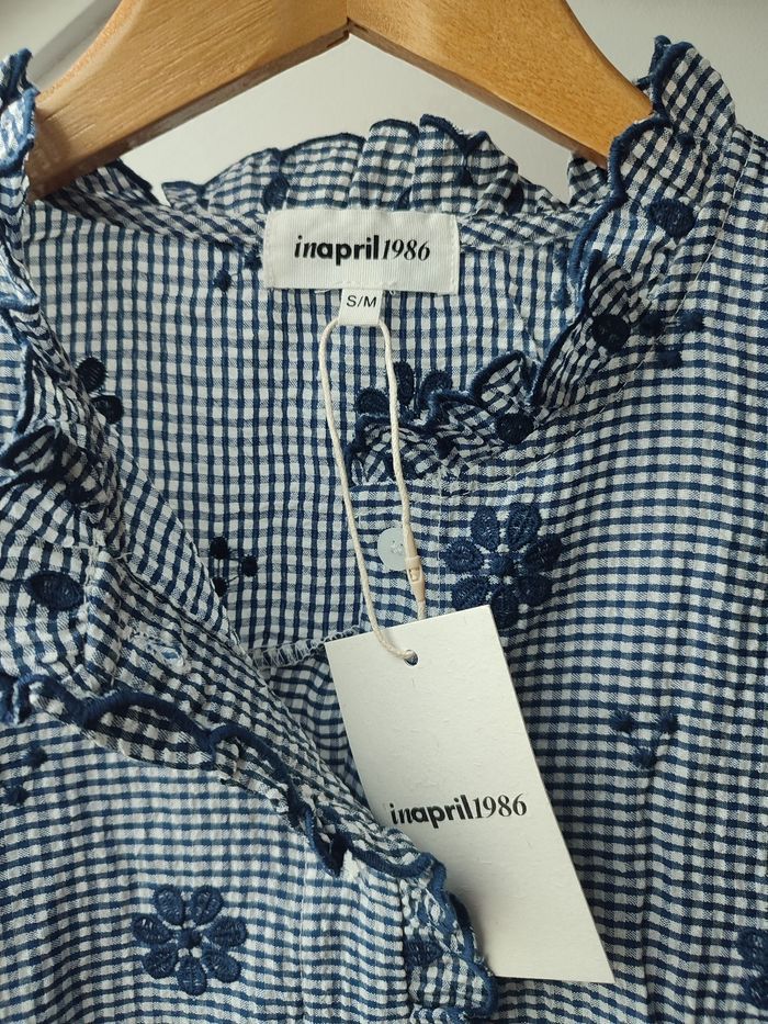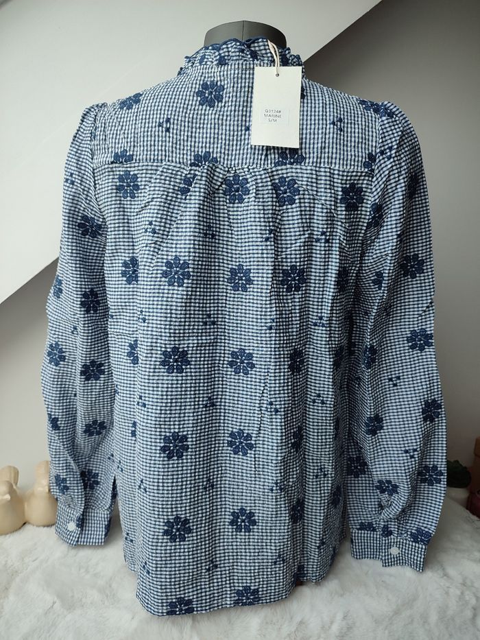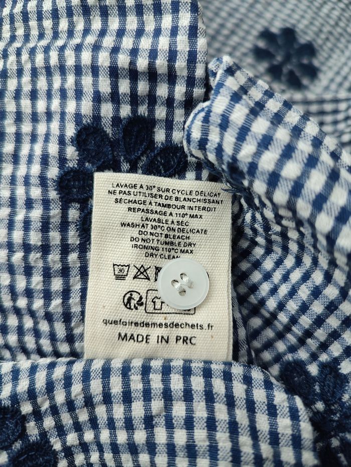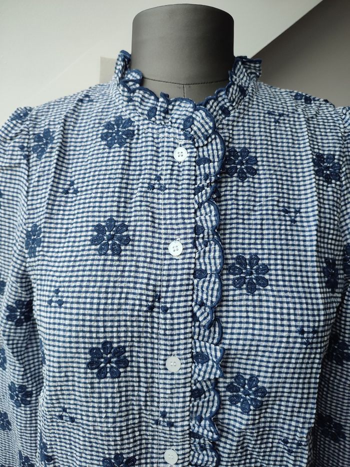 Chemise manches longues 100% coton motifs petits carreaux bleus, avec broderies ton sur ton Taille S/M Correspond à un S classique ou petit M Aisselle à aisselle 48 cm Longueur 64 cm