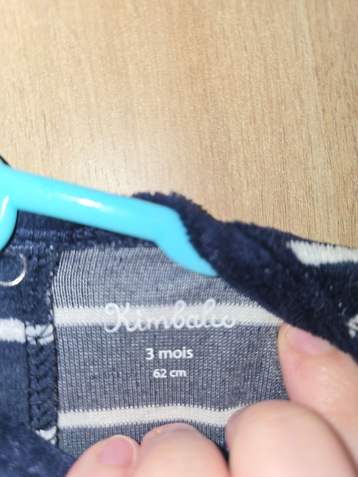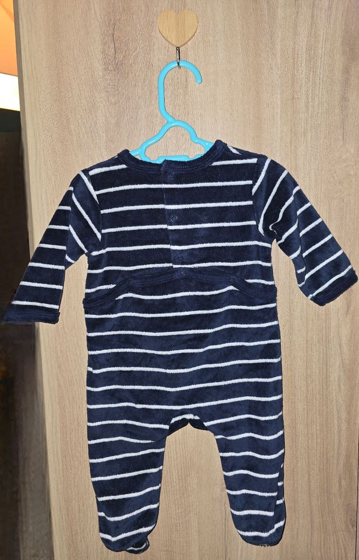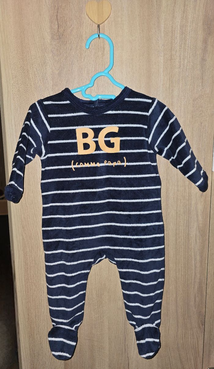 Pyjama bleu marine rayé blanc Taille : 3 mois, 62 cm "BG (comme papa) " Fermeture à pressions Très bon état, porté 1 ou 2 fois.