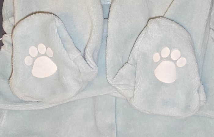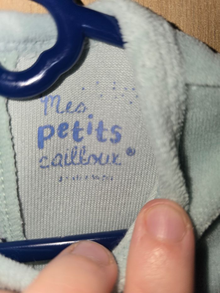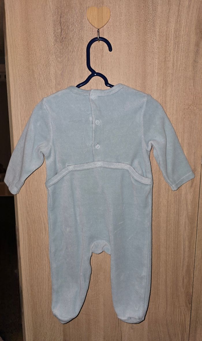 Pyjama petit ours avec les oreilles en relief et petites pattes d'ours en dessous des pieds, tout doux Couleur : bleu/vert Taille : 3 mois Fermeture à pressions Très bon état