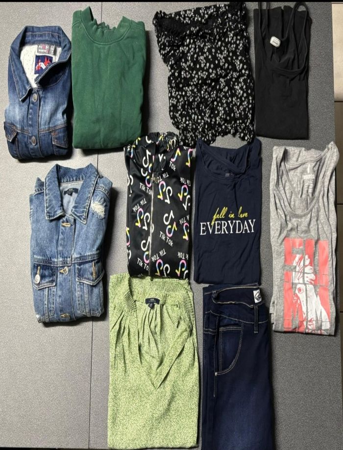 Lot de vêtement fille Taille 14 ans : 2 vestes en jean 1 veste fine TikTok 1 pull vert Bizzbee 1 jean 1 tee shirt manche courte 1 débardeur noir 1 robe 1 croc top 1 chemisier vert Bon état