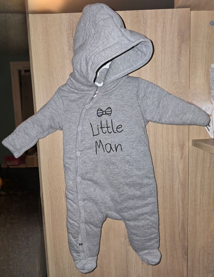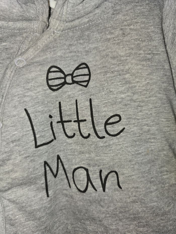 Combinaison grise chaude à capuche Taille : 1 mois, 56 cm "Little Man" Fermeture à pressions Très bon état