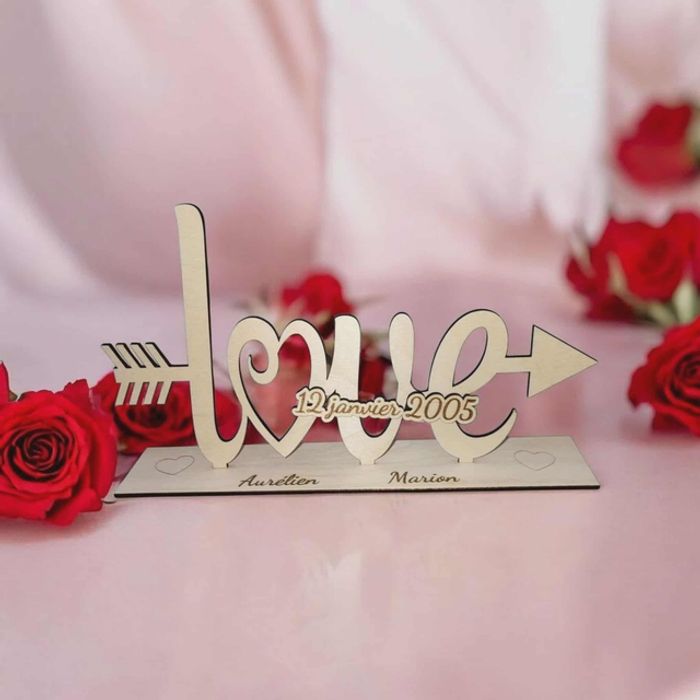 Un élégant décor en bois pour célébrer votre amour ❤️ 👉 Le mot LOVE sublimé par une flèche, avec un cœur intégré et votre date spéciale au centre 📏 Dimensions : environ Largeur 26cm / hauteur 15cm Ne pas acheter l'article m'envoyait un message privé merci