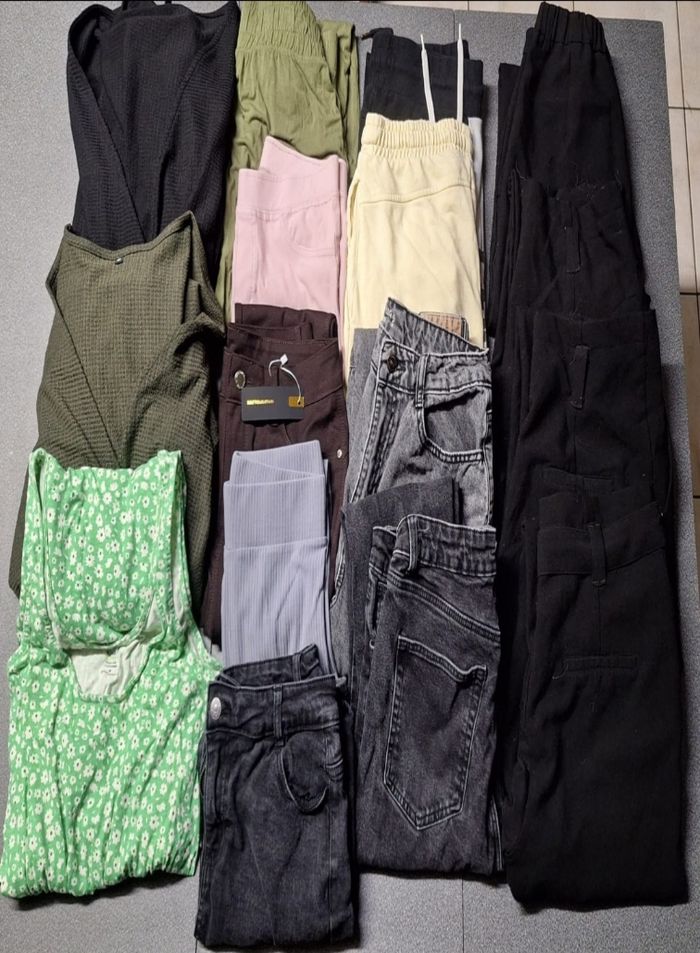 lot de vêtement femme taille M comprenant : 1 robe a bretelles 2 combi manche courte 1 short en jean 4 pantalons de costume 3 jeans 2 leggings 2 jogging 1 sarouelle Bon état