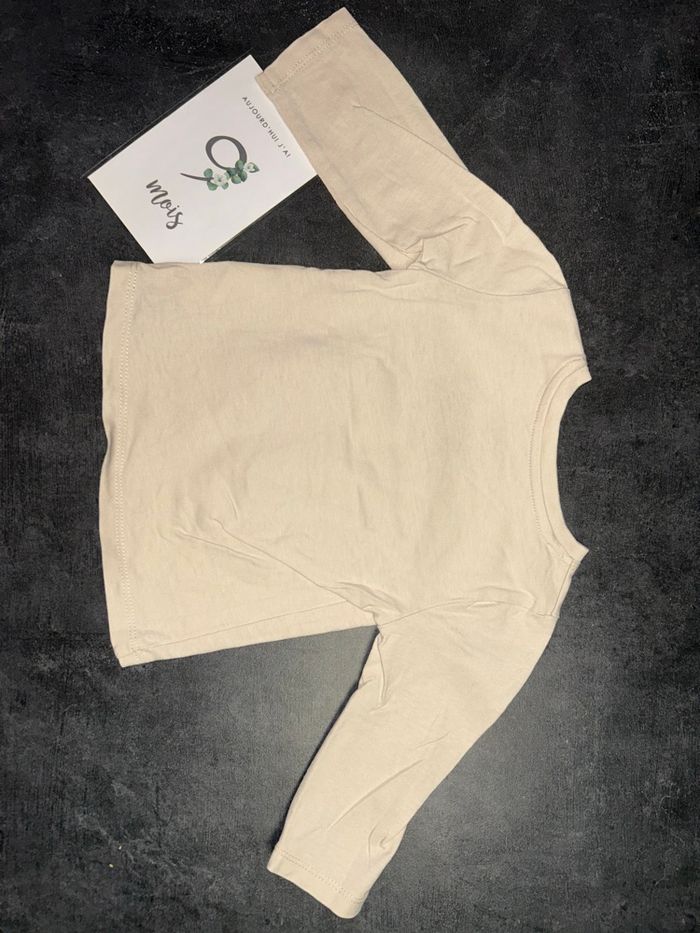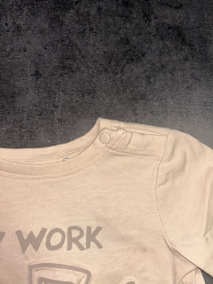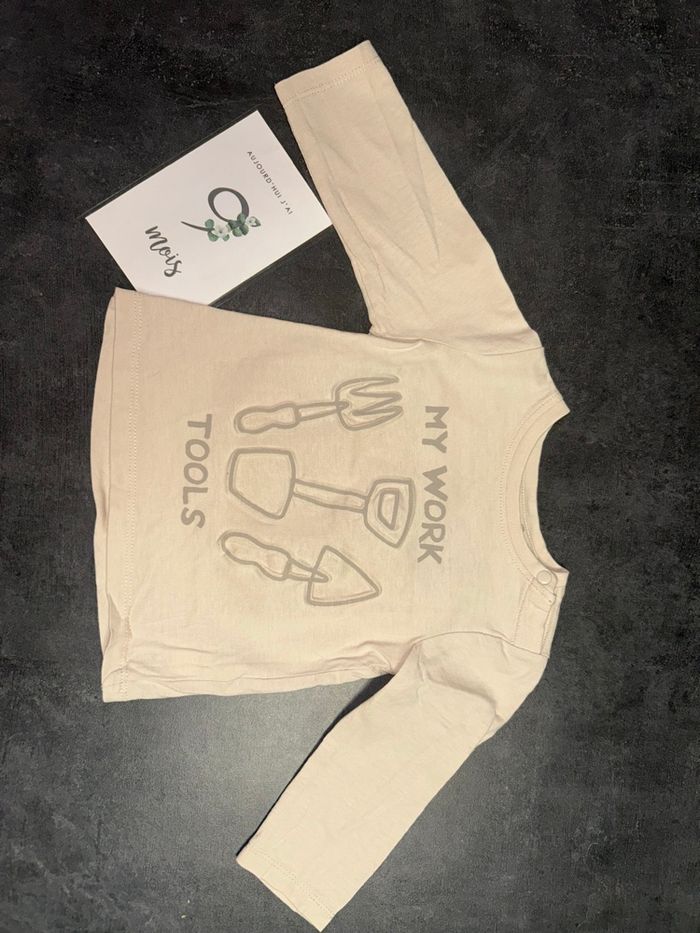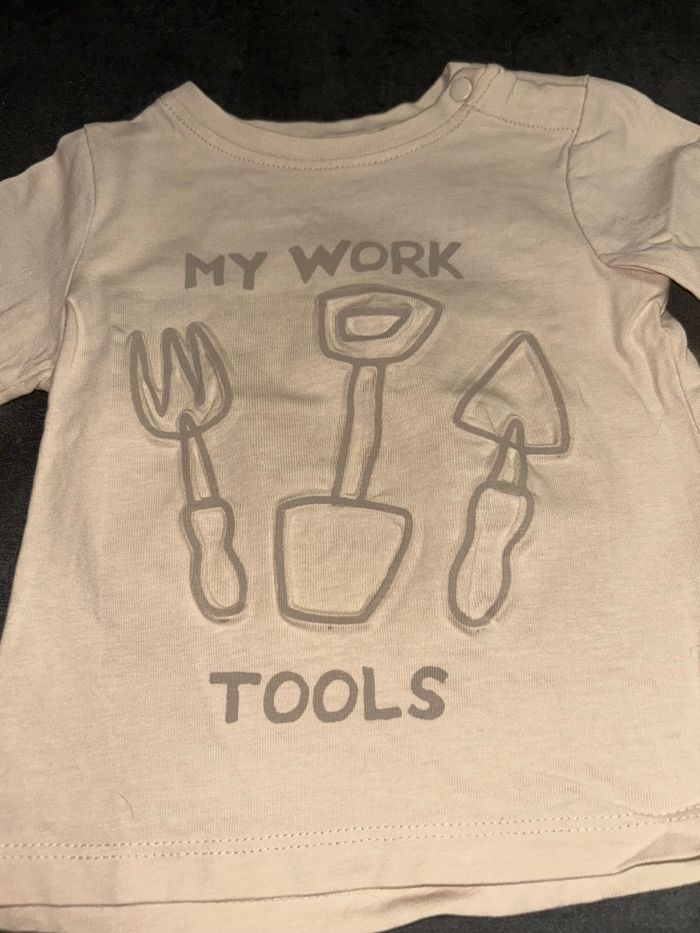 Haut fin bébé Couleur beige Motifs outils de jardin en relief avec inscription « my work tools » Pressions sur l’épaule Taille : 9 mois / 71 cm