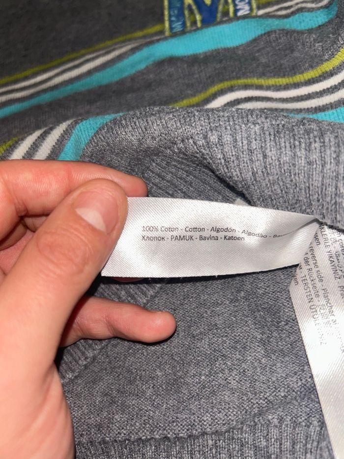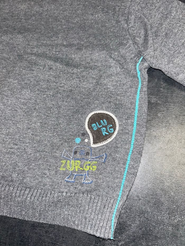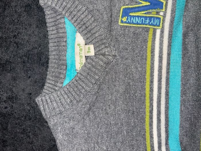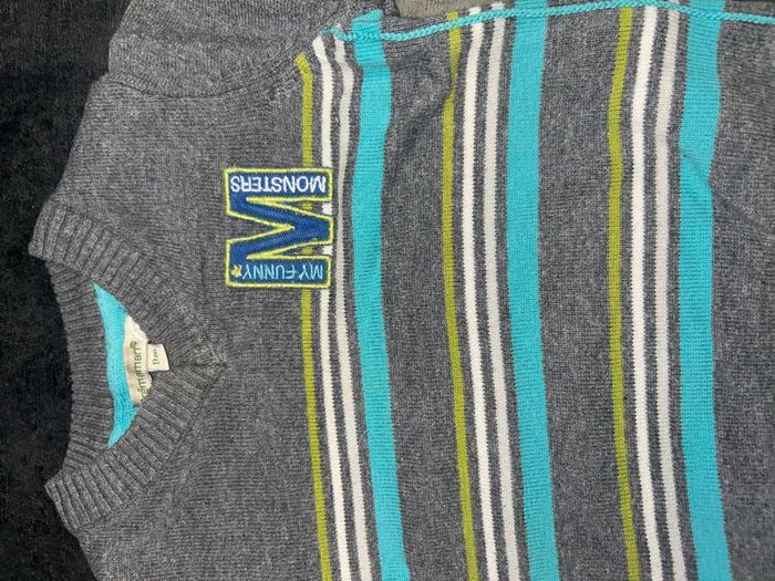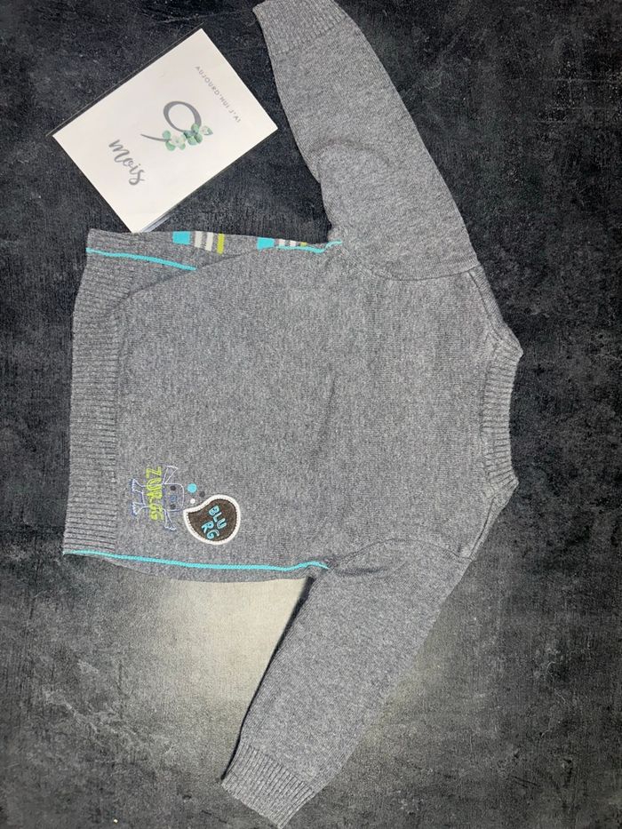 Pull bébé col en V Couleur gris avec rayures vertes et blanches Motifs M Taille : 9 mois