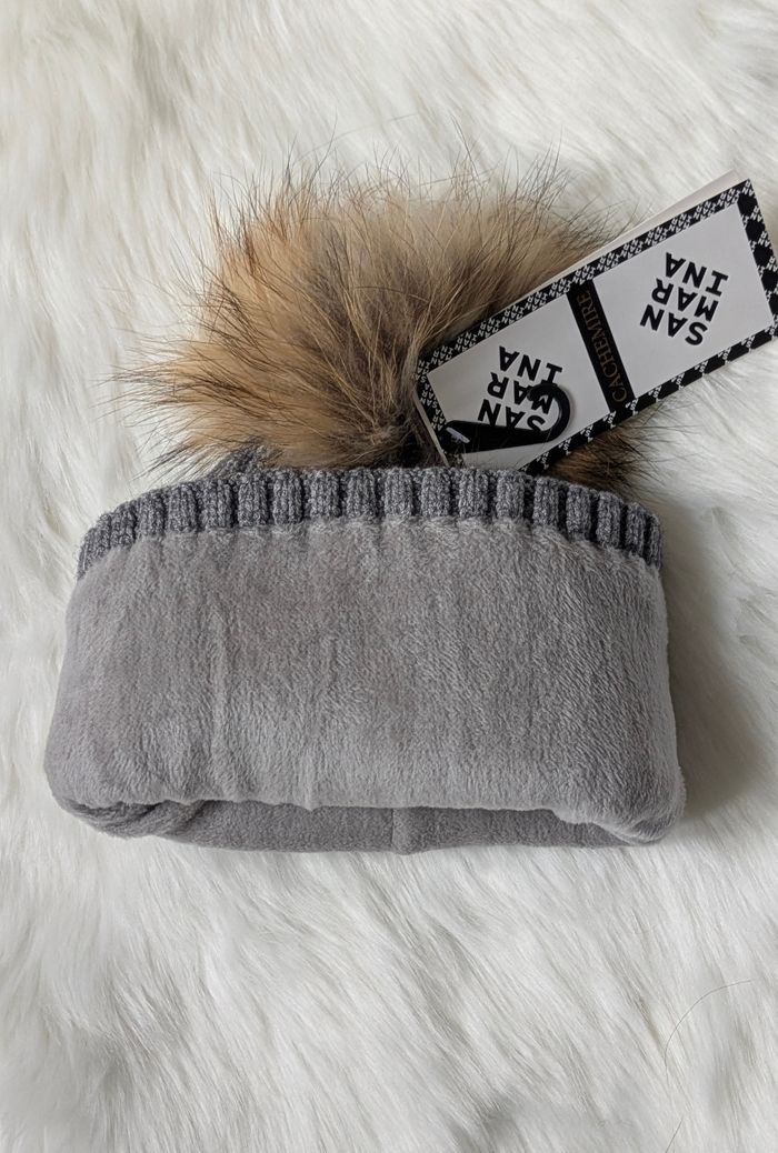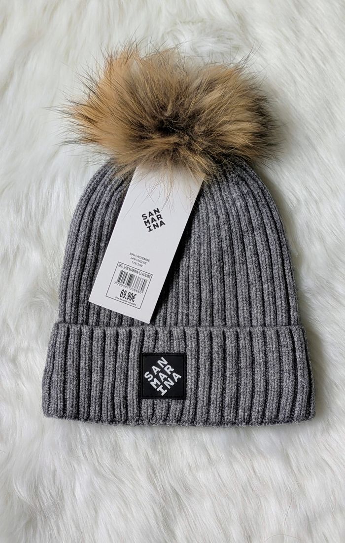 Superbe bonnet San Marina, qualité premium, neuf jamais porté. Pompon amovible. Intérieur doublé. Extensible et confortable.
