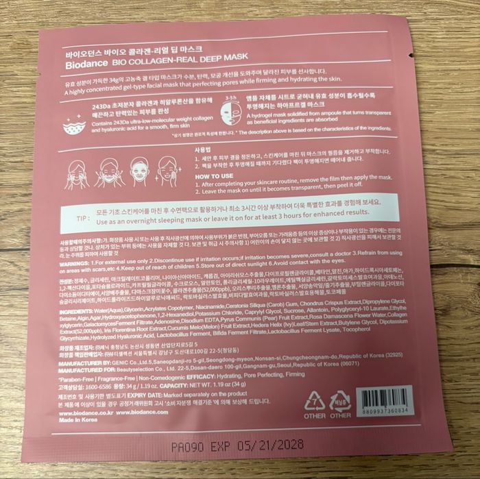 celles et jamais utilisé ni ouvert Expédition rapide 24/48 H Je réponds avec plaisir a vos questions :) Retrouve un teint éclatant et hydraté pendant la nuit avec le Bio-Collagen Real Deep Mask Biodance. Ce masque innovant est infusé de peptides de collagène de faible poids moléculaire pour améliorer l’élasticité et la fermeté de la peau, tandis que le filtrat de ferment Galactomyces et le niacinamide éclaircissent et affinent les irrégularités du teint. L’acide oligo-hyaluronique pénètre en profondeur dans la peau pour une hydratation intense, laissant ton teint lisse, rebondi et éclatant. Ce masque à ampoules solidifiées est absorbé en douceur par la peau et devient transparent en quelques heures, garantissant ainsi la diffusion complète de ses ingrédients actifs. Recommandé pour : Peaux sèches, tous types de peaux. Conseils d’utilisation : • Applique le masque uniformément sur ton visage, lisse-le délicatement le masque sur ta peau, en évitant le contour des yeux et de la bouche. • Laisse le masque en place toute la nuit ou au moins 3-4 heures. • Tapote légèrement ta peau pour faire pénétrer le reste de l’essence dans ta peau.