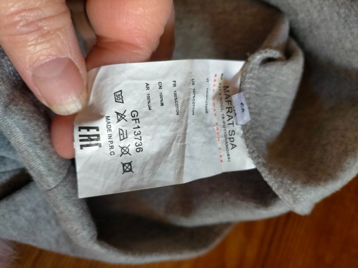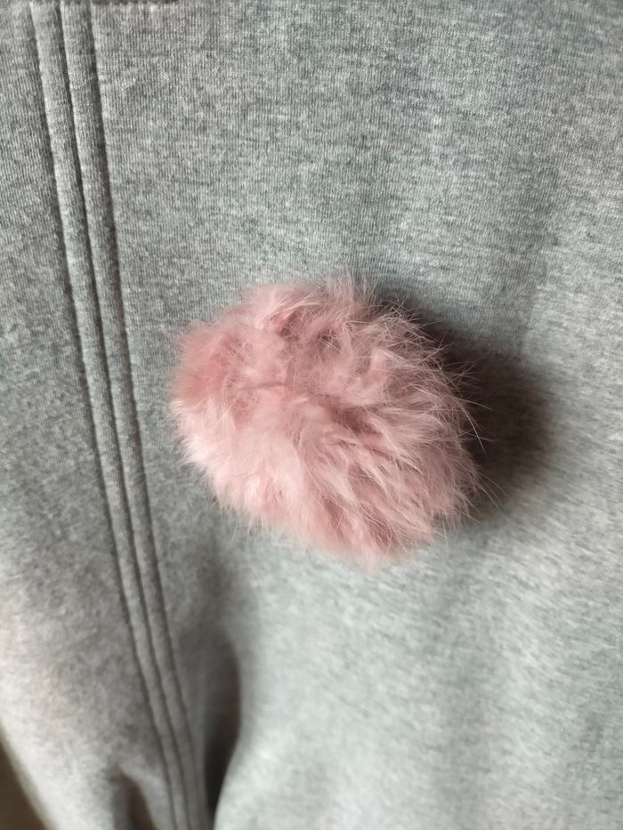 Comme neuve. Très jolie robe à manches courtes de forme boule en molleton type néoprène gris. Très épais et très chaud. Broche pompon en fausse fourrure rose. Superbe portée, très belle qualité du luxe italien au prix d'achat autour de 200 euro