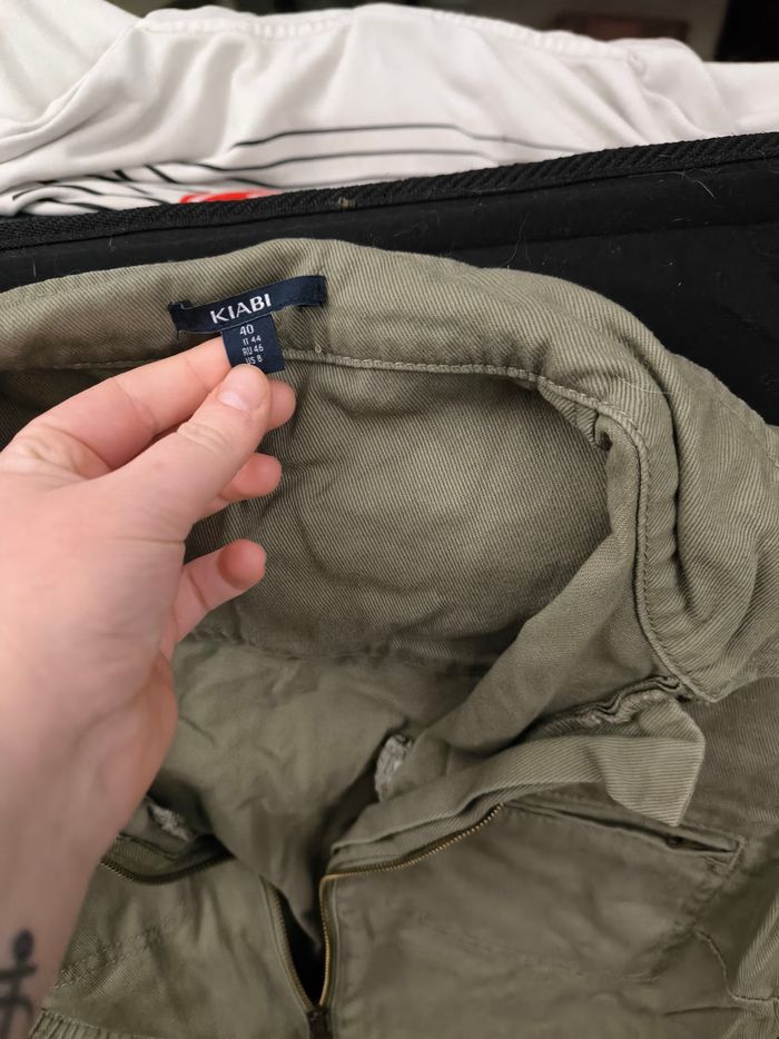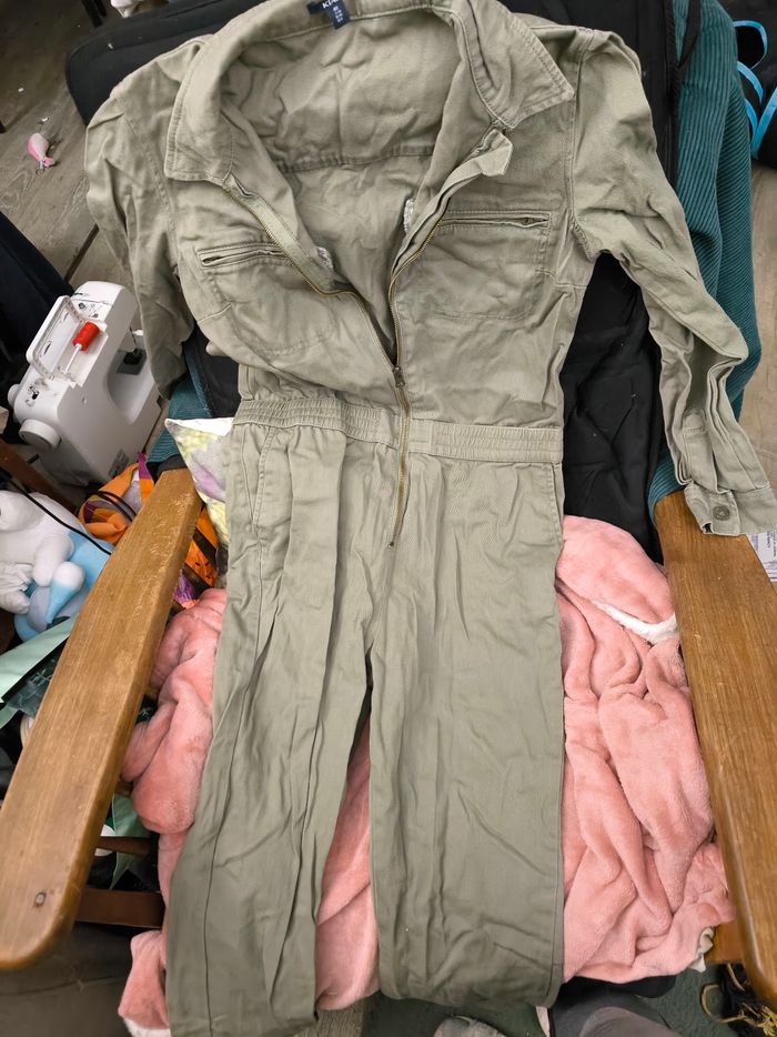 Combinaison kaki de la marque Kiabi en taille 40. Matière proche du jean peu extensible mais restant malgré tout confortable. Très peu portée Elle a besoin d'être repassée car conservée dans un sac depuis un moment.