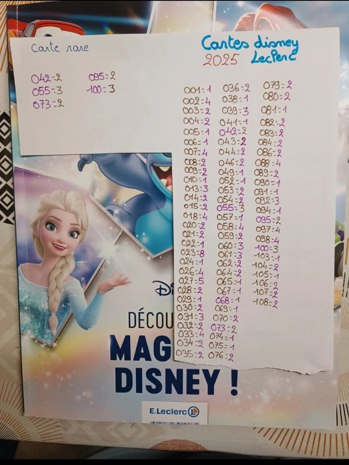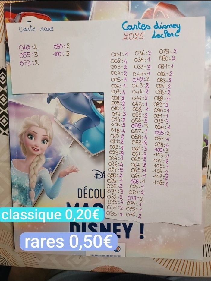 ⚠️ne pas acheter l'annonce⚠️ Je vends des cartes Disney à collectionner (collection Leclerc 2025). Idéal pour compléter ta collection ✨ ATTENTION CA PART VITE déjà plusieurs sont pas, n'hésitez pas à m'envoyer ta liste La Cartes classique 0,20€ pieces La Cartes rares 0,50€ pieces (cartes qui brille et réagi à la la chaleur de la main) ENVOYE MOI TA LISTE CA PART TRÈS VITE 😊 👇 ces cartes carte a vendre 👇 001 (1) • 002 (4) • 003 (3) • 004 (2) • 005 (1) • 006 (1) • 007 (3) • 008 (2) • 009 (2) • 010 (1) 013 (3) • 014 (2) • 015 (2) • 018 (4) • 020 (2) • 021 (1) • 022 (1) 023 (8) 24 (1) 025 (1) • 026 (4) • 027 (5) • 028 (2) • 029 (1) • 030 (2) • 031 (3) • 032 (2) 033 (4) • 034(2) • 035 (2) • 036 (2) 038 (1) 039 (3) • 041 (1) • 042 (2) 043 (2) • 044 (2) • 046 (1) • 049 (1) 052 (1) • 053 (2) • 054 (2) 055 (3) • 057 (1) • 058 (4) • 059 (2) 060 (3) • 061 (3) • 062 (2) 064 (2) • 065 (1). 067(1) 068 (1) • 069 (1) • 070 (2) • 073 (2) • 074 (1) 075(1) • 076 (2) • 079 (2) • 080 (2) 081 (2) • 082 (2) • 083 (2) 084 (2) • 086 (2) • 088 (4) • 089 (2) • 090 (1) • 091 (1) • 092(3) 094 (1) • 095 (2) • 097 (4) • 098(4) • 100 (3) • 104 (2). 105 (1) 106 (2) • 107 (2) • 108(2)) N’hésite pas à me dire a m'envoyer ta liste,si tu veux compléter ta collection ! Voir les photos 📸 😌ENVOI RAPIDE🎁 jour même où le lendemain 📦 QUE EN MONDIAL RELAY 📦 💌 Envoi rapide et soigné 🌸 envoie rapide 🌸 aujourd'hui ou demain #disney#cartesdisney#collectiondisney#cartesacollectionner#disneyleclerc#cartesleclerc#lot#lotdisney#collection#gooddeal#disney#cartesacollectionner#collectionneur#disneyfans#cartedisneylecler2025#debo2930#cartedisneyleclectalunite#cartedisneyenlot2025