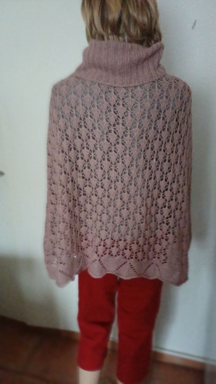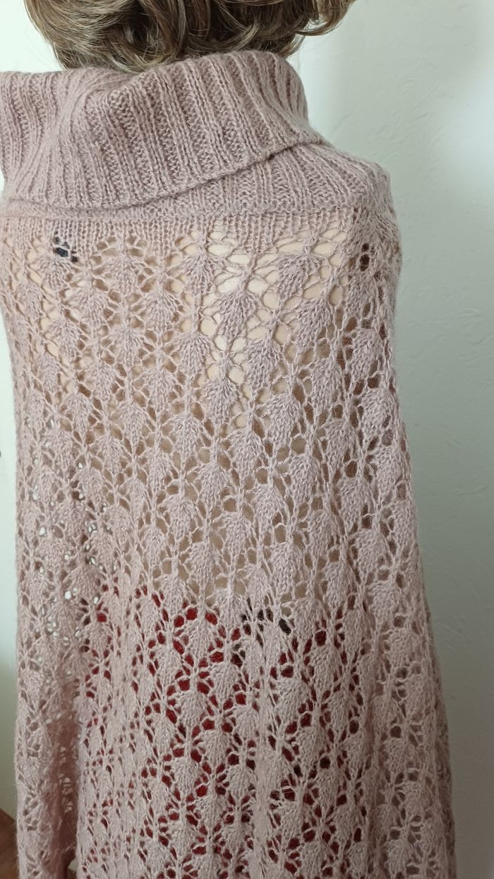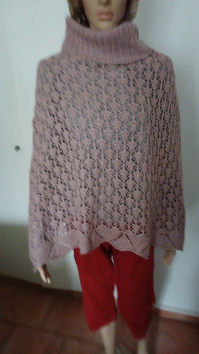 Cape style crochet avec de la laine. Demi saison couleur lilas. Longueur 71cm. Col retourné 19cm Emplitude de la Cape. Milieu 70cm Largeur du bas 93.