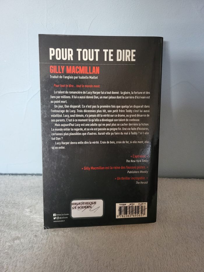 ⚠️Ancien livre de bibliothèque, ouvrage couvert, avec tampons de la bibliothèque et étiquettes sur la couverture. Livre Pour tout te dire De l'auteur Gilly Macmillan * D'occasion, contours des pages jauni et tachées. Dernières pages légèrement pliée en bas et marque de pliures sur la 1ère page. ➺ Informations : . Éditions Les Escales . Collection Noir . Livre en Français