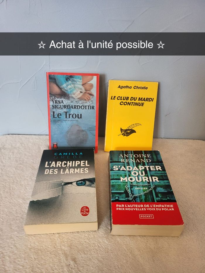 ⇨ Achat à l'unité possible // Plus de photos sur demande Lot de 4 livres policiers, thriller : . Livre Le Trou De l'auteur Yrsa Sigurdardottir * D'occasion, avec des léger défauts dans les coins et sur le bord des pages en haut. Les pages ont jauni. ➺ Informations : . Achat à l'unité - 2€ . Éditions Babel Noir . Livre en Français ______________________________________________ . Livre Le club du mardi continue De Agatha Christie * D'occasion, la couverture est marquée / abîmée. Pages très jaunies. Marque de stylo dans la couverture intérieur. . ➺ Informations : . Achat à l'unité - 2€ . Éditions Librairie Les Champs-Élysées . Livre en Français _______________________________________________ . Livre L'Archipel des lärmes De l'auteur Camilla Grebe * D'occasion, des défauts sur la couverture et pages jauni. ➺ Informations : . Achat à l'unité - 2€ . Éditions Le livre de poche . Livre en Français _______________________________________________ . Livre S'adapter ou mourir De l'auteur Antoine Renand * D'occasion, couverture assez abîmée et les pages jauni. Écritures au crayon dans la 1ére page et marque de pliures sur la page avec le titre. ➺ Informations : . Achat à l'unité - 2€ . Éditions Pocket . Livre en Français