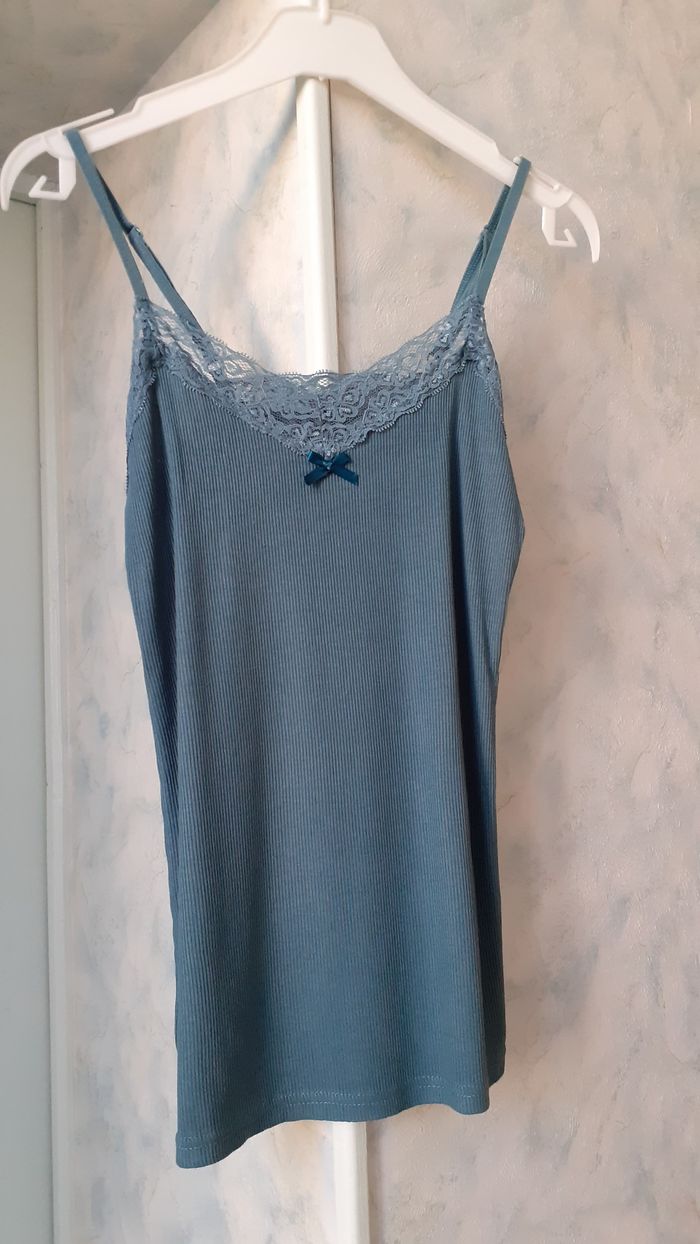 Vends un caraco fin et fluide, bretelles réglables, aspect côtelé, dentelle sur le buste, couleur bleu canard, taille M sur l'étiquette, 36-38. Longueur sous aisselle : 42 cm Largeur aisselle à aisselle : 31 cm.