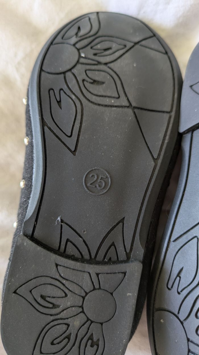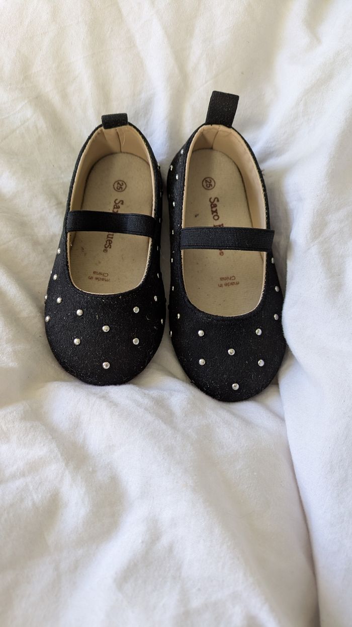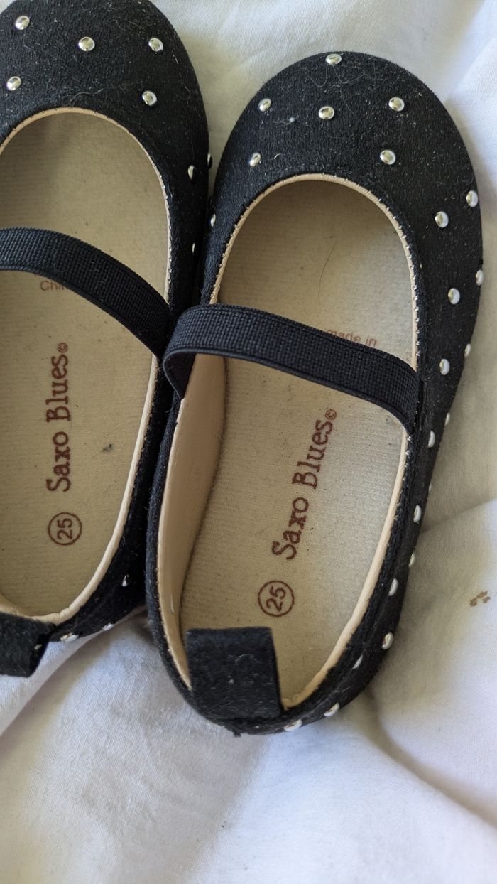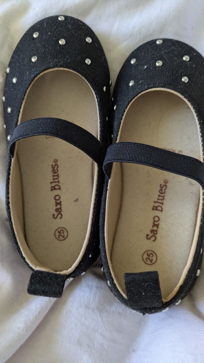 Vends cette adorable paire de ballerines pour petite fille de la marque Saxo 🎀 Couleur : Noir avec de petits clous argentés style "pois" pour un effet brillant très chic. Pointure : 25. Détails : * Élastique sur le dessus du pied pour un maintien optimal (ne se déchaussent pas en marchant). Petite languette à l'arrière pour les enfiler facilement. Intérieur confortable. État : Très bon état général (voir photos pour les détails). Parfaites pour une cérémonie, un anniversaire ou simplement pour être la plus belle à l'école ! 👗💫 Porté une seul fois pour Noël achetées 18€.
