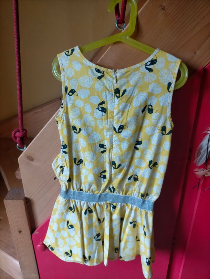 TBE Très jolie robe sans manche en cotonnade jaune imprimé de feuillage blanc et oiseaux noirs. Col V bordé d'un volant, taille élastique argenté et zip au dos