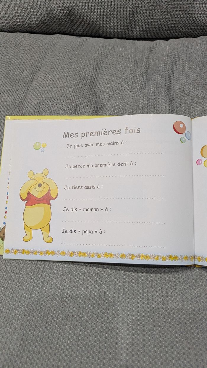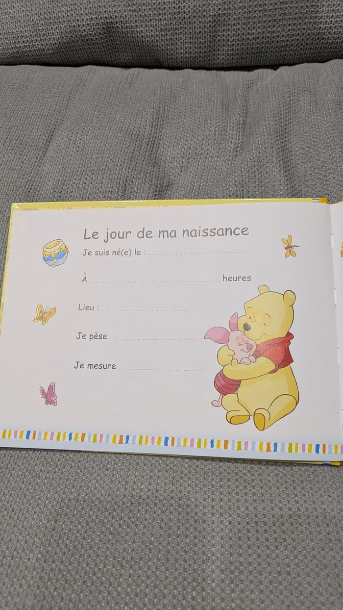 Livre pour enfant Disney – Winnie l’Ourson : Mon album souvenirs. Un joli livre à remplir jour après jour pour conserver les souvenirs de l’enfance 📖✨ Illustrations colorées avec Winnie, Tigrou, Bourriquet et Porcinet. Idéal comme cadeau de naissance ou pour un jeune enfant.