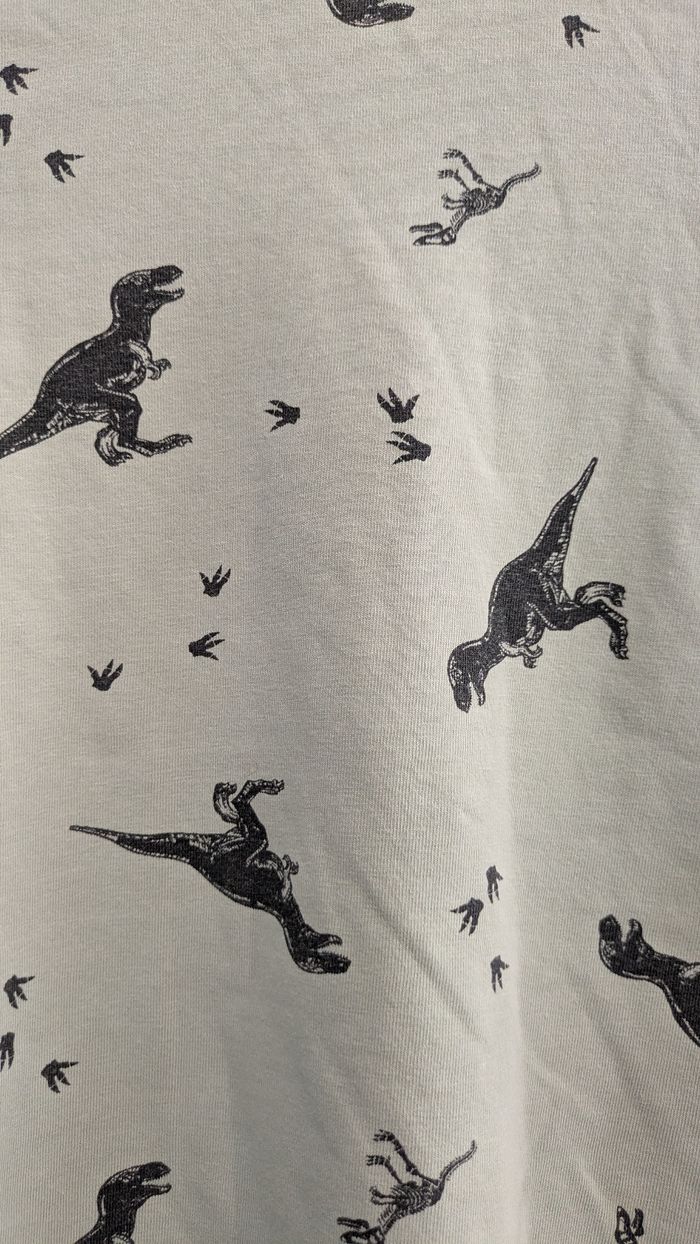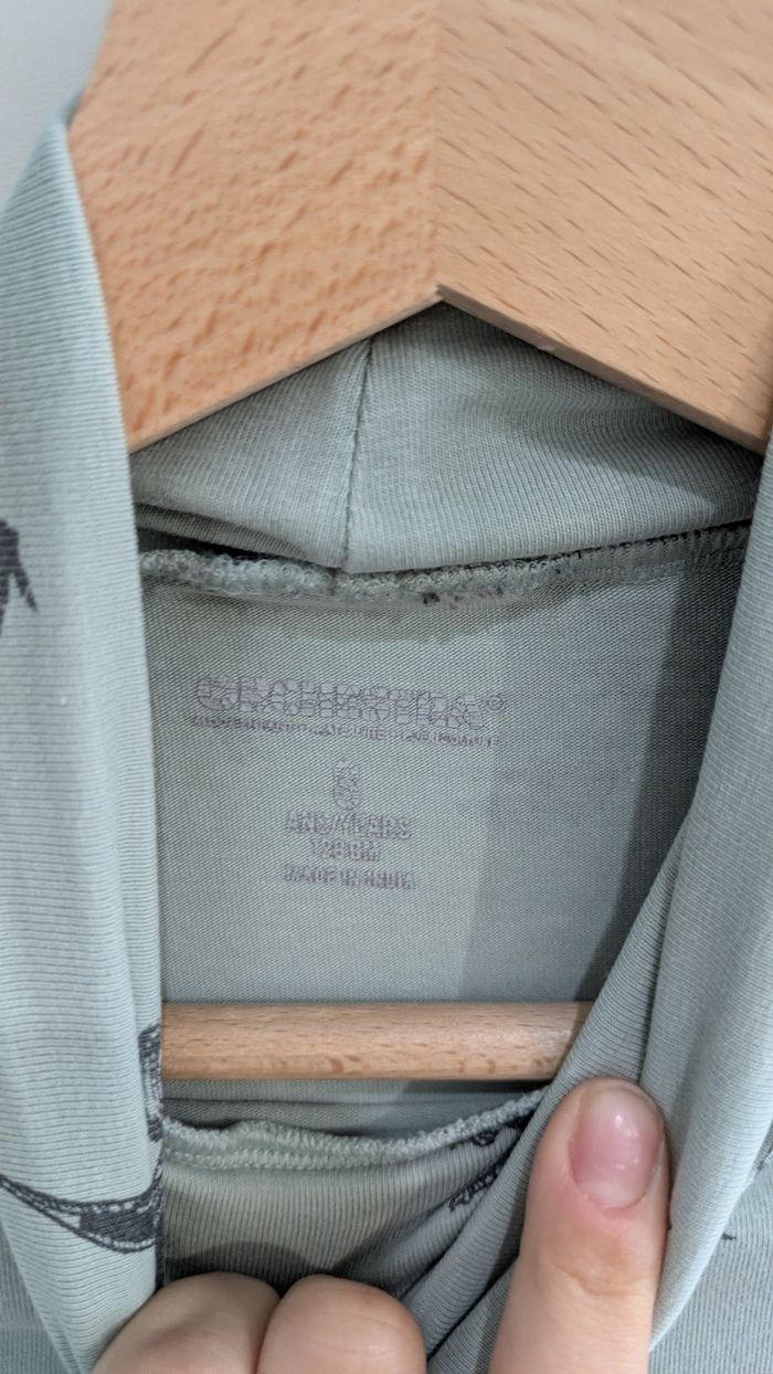 Haut à manches longues Orchestra, taille 8 ans. Couleur vert clair, avec un imprimé de dinosaures noirs sur toute la surface — parfait pour les petits explorateurs ! 👕 Tissu doux et confortable, coupe agréable à porter au quotidien. 🌿 En très bon état, sans tache ni trou. 📏 Taille : 8 ans 🏷️ Marque : Orchestra 💌 Envoi rapide et soigné