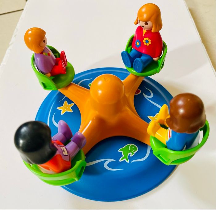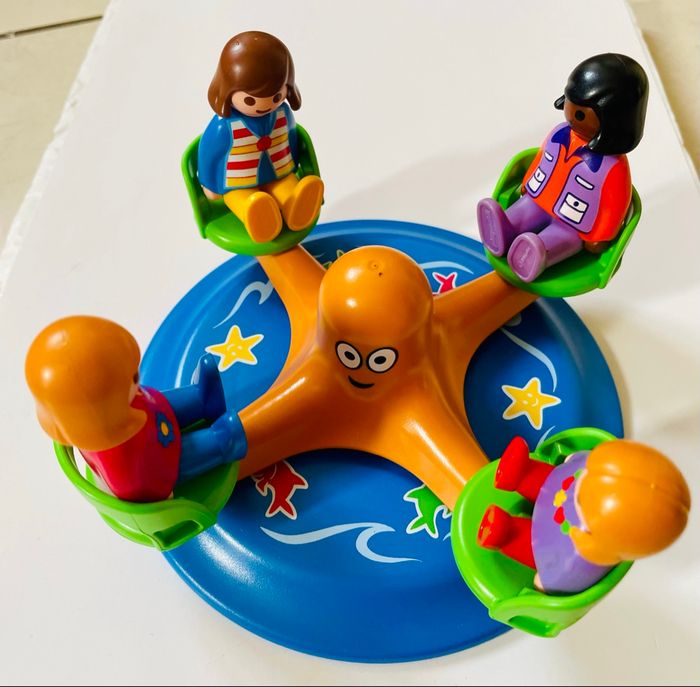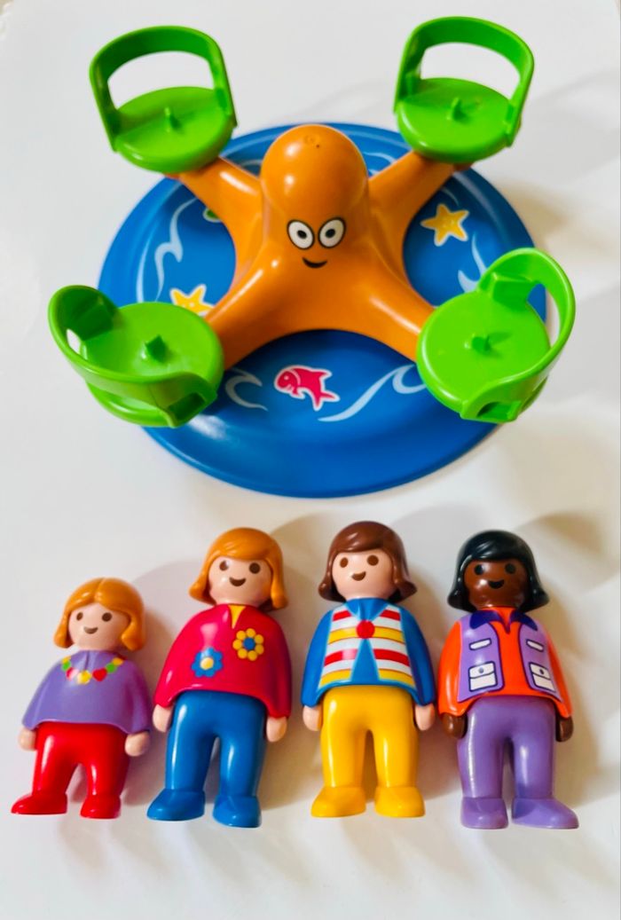 Playmobil 1.2.3 Le manège. Avec 4 figurines Pas de boîte ni de notice « Youpi ! » Les enfants peuvent jouer sur le carrousel qui tourne dans les deux sens. « Oh la la, j’ai le tournis », dit la petite fille en rigolant. « Alors tournons dans l’autre sens ! », propose son frère. Aussitôt dit, aussitôt fait. Il possède quatre places pour les personnages. Pour faire tourner le carrousel, il suffit de tenir le pommeau central (la tête de la pieuvre) avec les doigts et de donner de l’élan en tournant. Dimensions : 17 x 17 x 6 cm (LxPxH).- Les quatre sièges du carrousel peuvent accueillir des personnages 1.2.3. Les sièges tournent entièrement pour que les personnages puissent regarder dans toutes les directions.- Pour faire tourner le carrousel, il suffit de tenir le pommeau central (la tête de la pieuvre) avec les doigts et de donner de l’élan en tournant. Le carrousel tourne dans les deux sens.