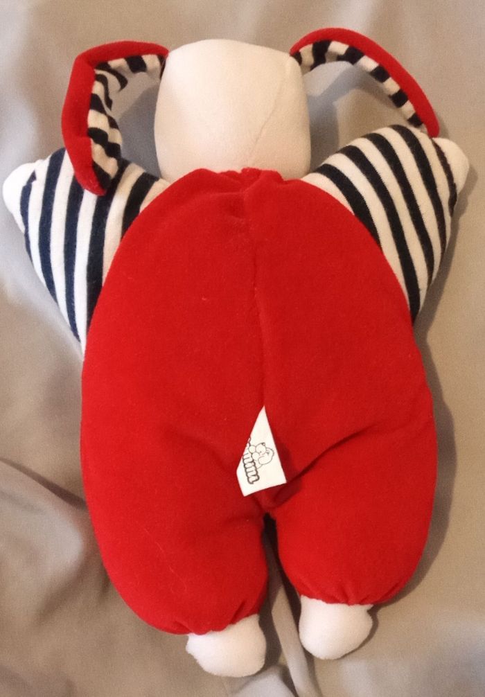 doudou peluche lapin lapine chien blanc rouge bleu marine ressemble à un chien vintage ancien Jemini posture debout resse