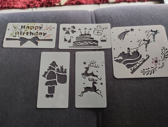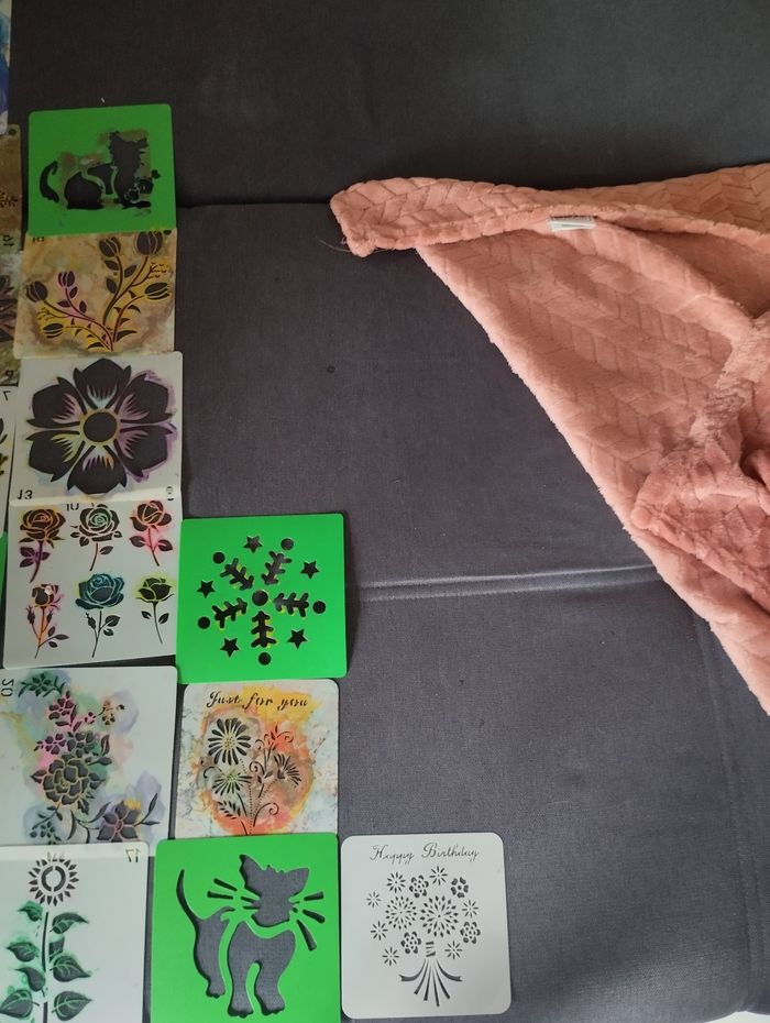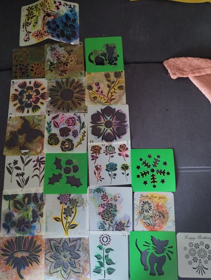 Pochoir coloré – Création joyeuse pour tous Ce pochoir aux teintes claires et lumineuses invite à une expression artistique accessible à tous, des plus jeunes aux plus expérimentés. Ses motifs variés – floraux, animaux, festifs ou abstraits – éveillent l’imagination et s’adaptent à chaque projet : cartes, textiles, carnets, décorations. Facile à manipuler, il transforme chaque geste en moment de calme et de plaisir. Sa matière souple et résistante permet une utilisation avec crayons, feutres, peinture ou pâte à texture. Un compagnon idéal pour les ateliers partager.bon état déjà utilisé il y a de la la peinture sur certain pochoirs mais ils sont en bon état