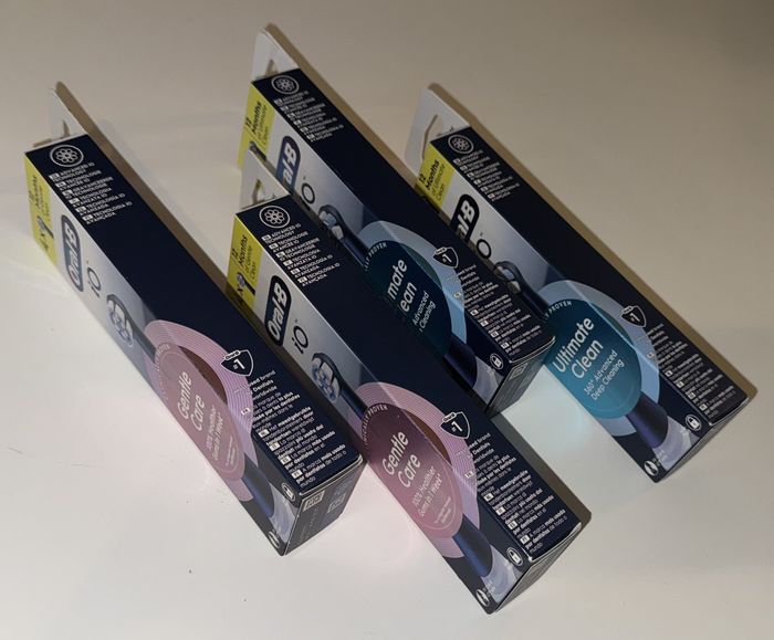► 2 Oral-B Set of 4 Replacement Brush Heads Gentle Care Genuine Black Softest Brush Suitable for Sensitive Gums Round Brush for Oral B iO Electric Toothbrushes. ► 2 Oral-B Ultimate Clean Genuine Black Replacement Brushes Set of 4 Deep Brushing Dental Plaque Removal Round Brush for Oral B iO Electric Brushes. État neuf Produits neufs dans leur emballage d'origine scellé, jamais ouverts.